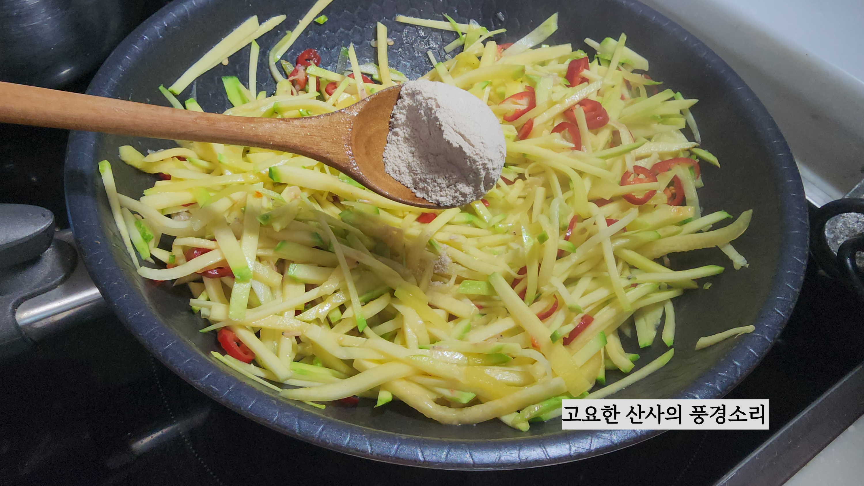 ▶ 재료 : 애호박 1개, 홍초 1개, 육수 1/2컵, 새우젓 1숟가락, 표고가루 2숟가락, 식용유, 마늘, 참기름, 깨소금 약간