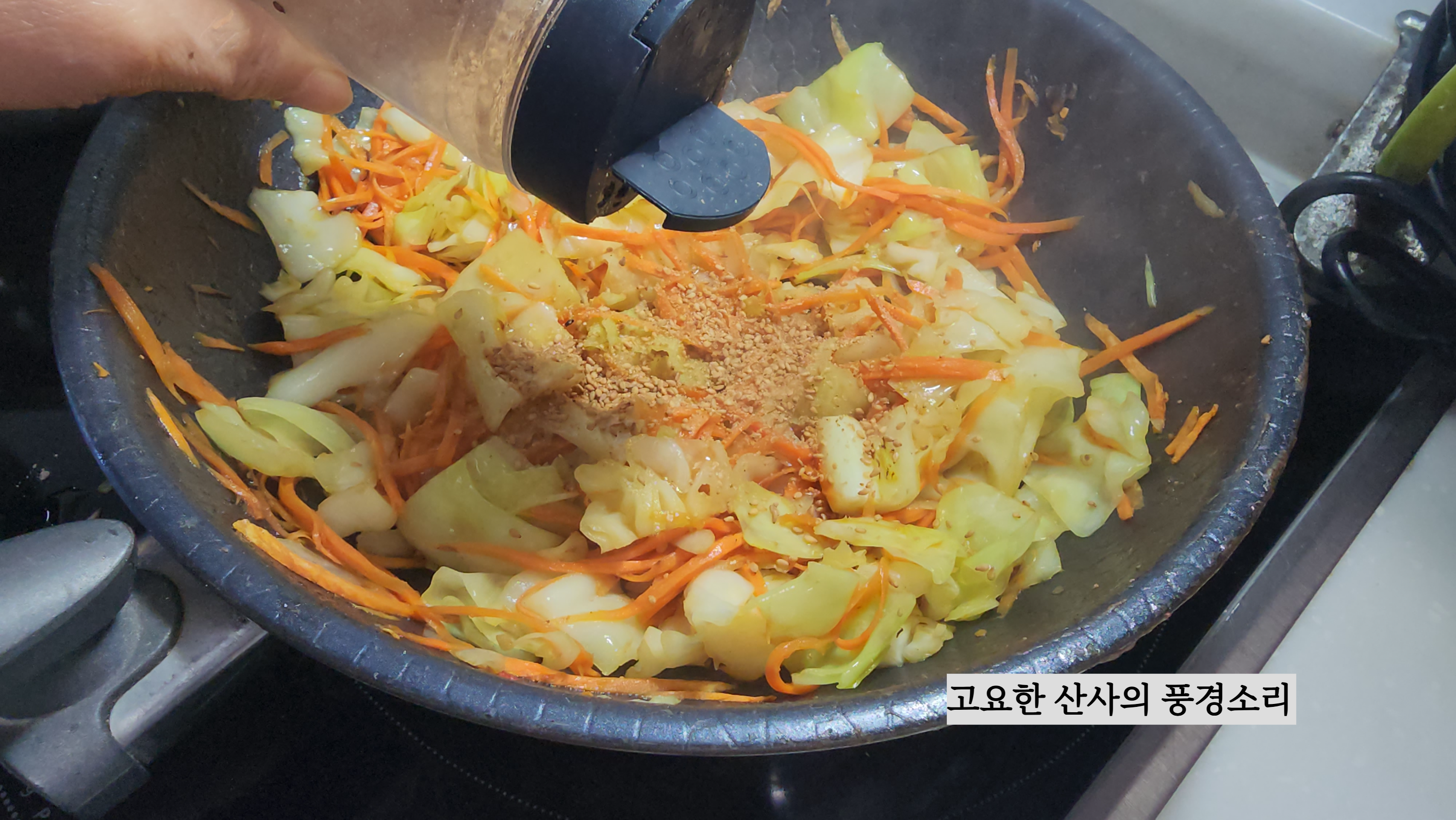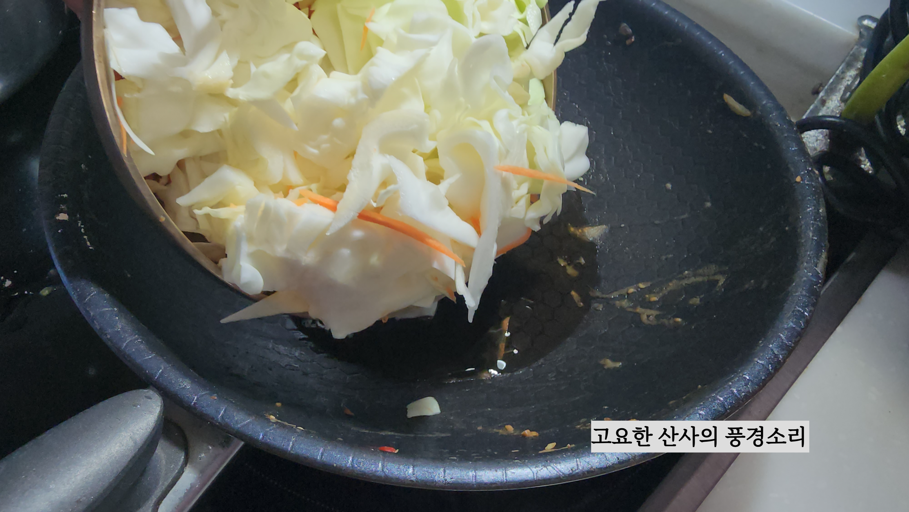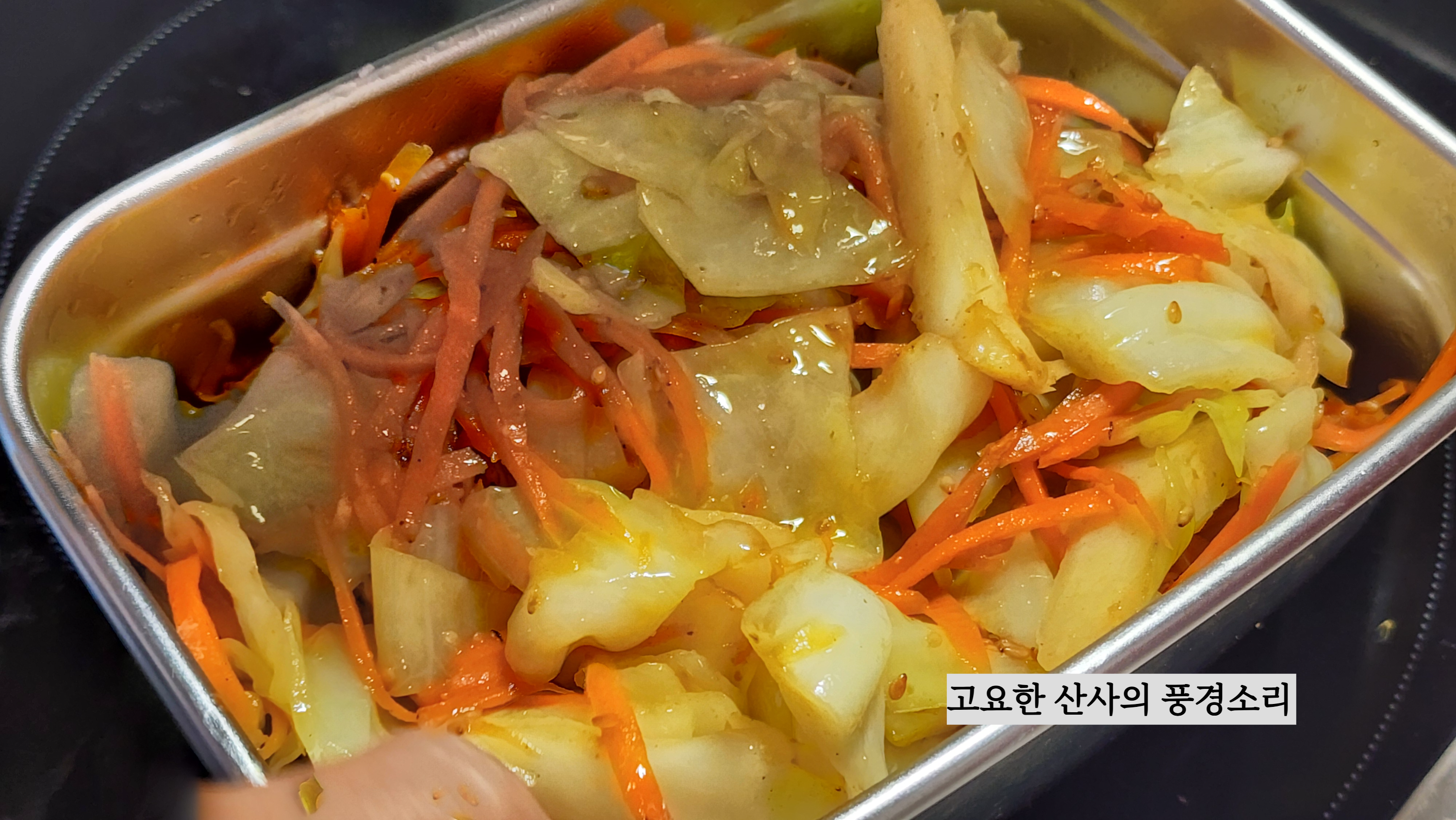 ▶ 재료 : 양배추 100g, 당근 1개, 멸치액젓 1숟가락, 굴소스 1숟가락, 식용유, 마늘, 참기름, 깨소금 약간