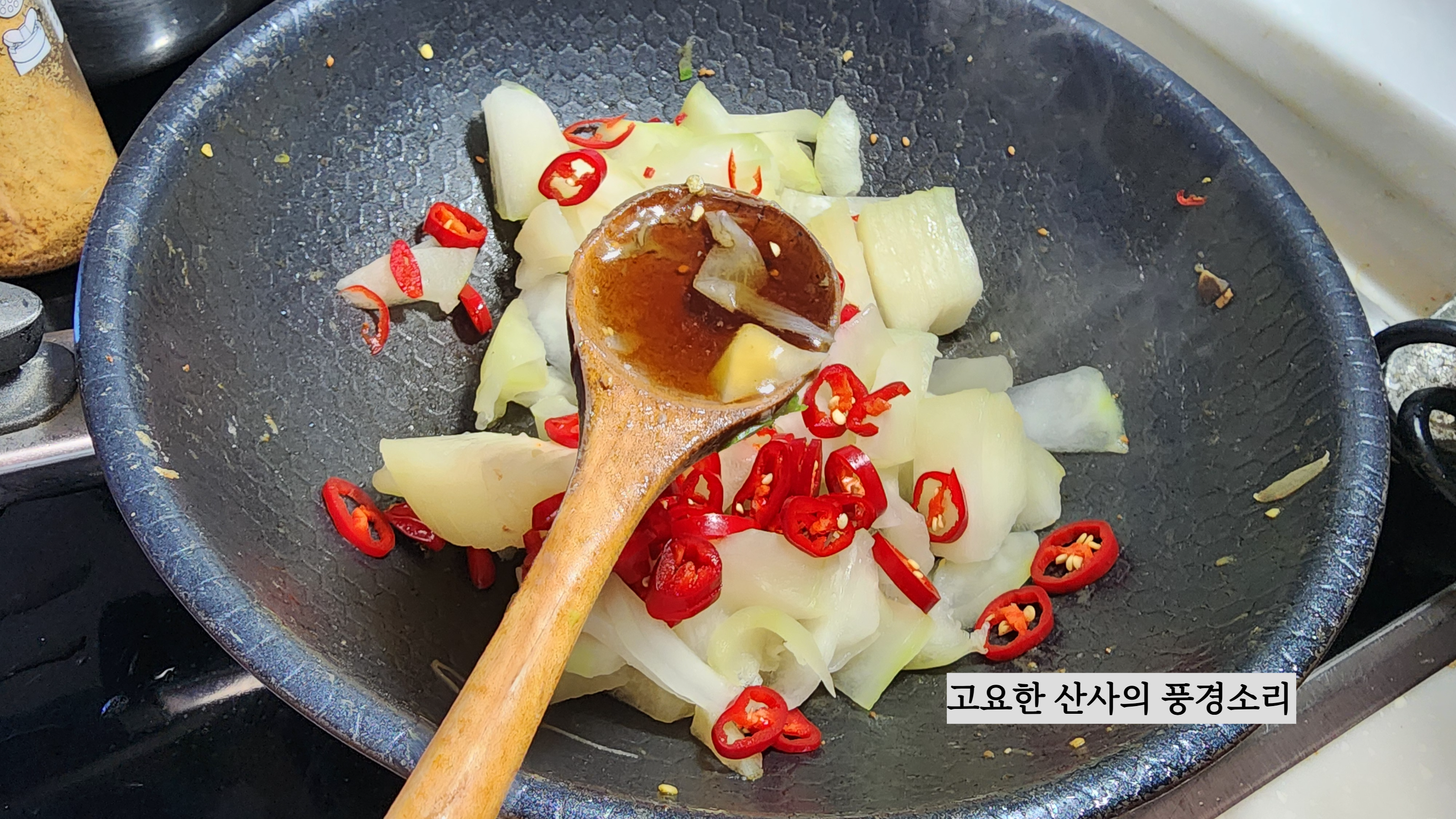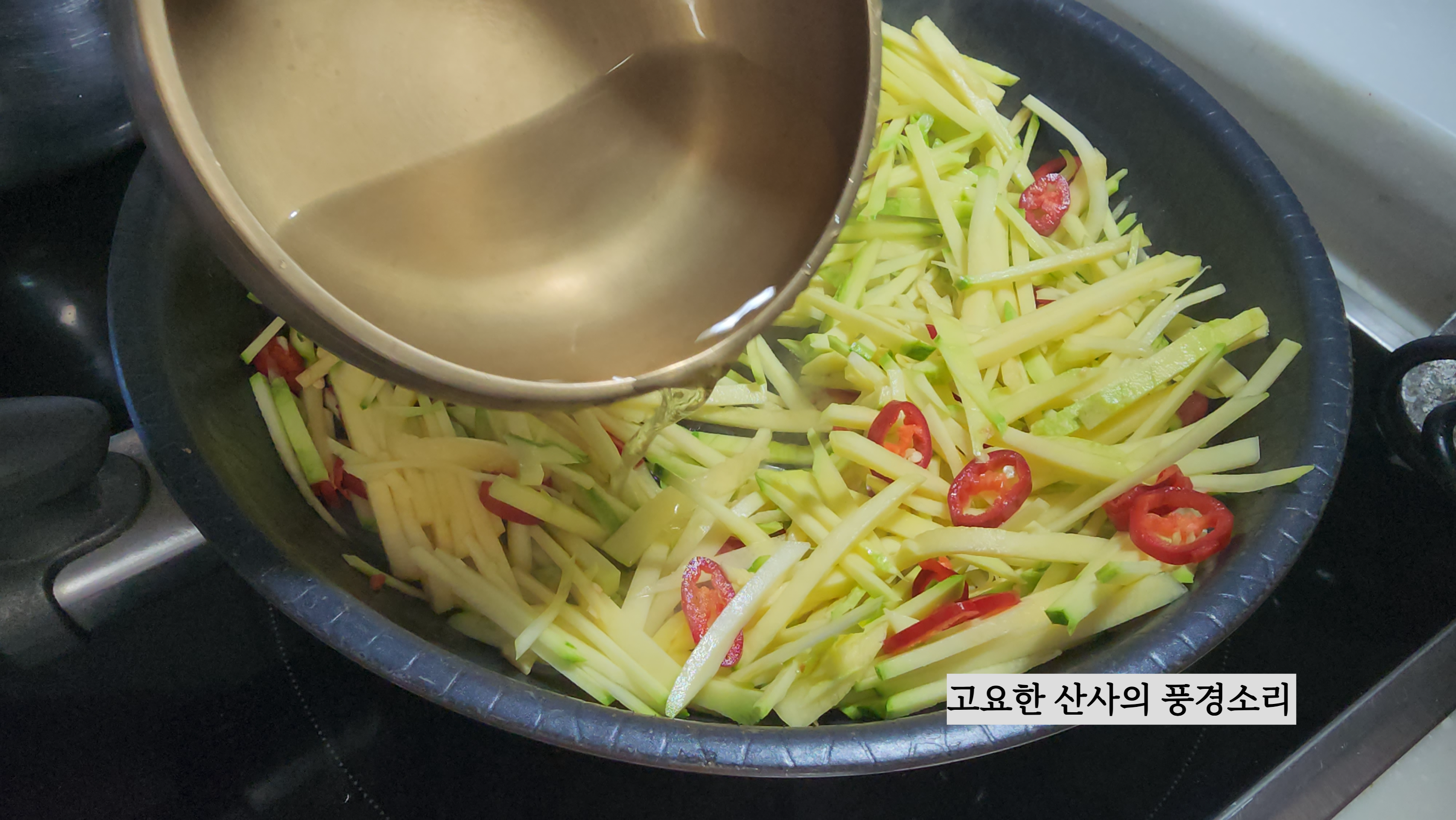 ㉠ 식용유, 마늘, 박, 홍초를 넣고 볶아준다.