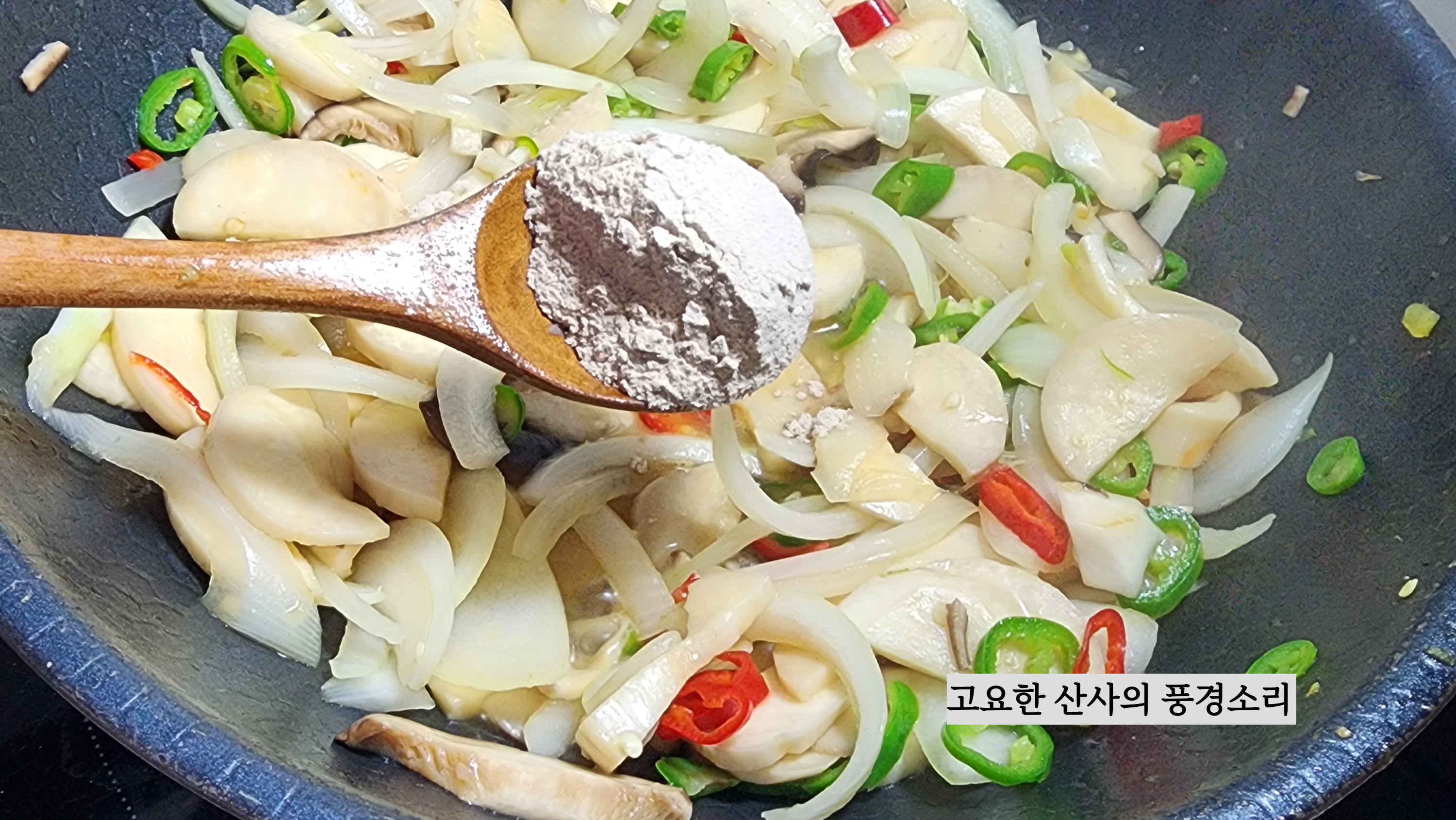 ㉡ 육수, 새우젓, 표고가루를 넣고 볶아준다.
