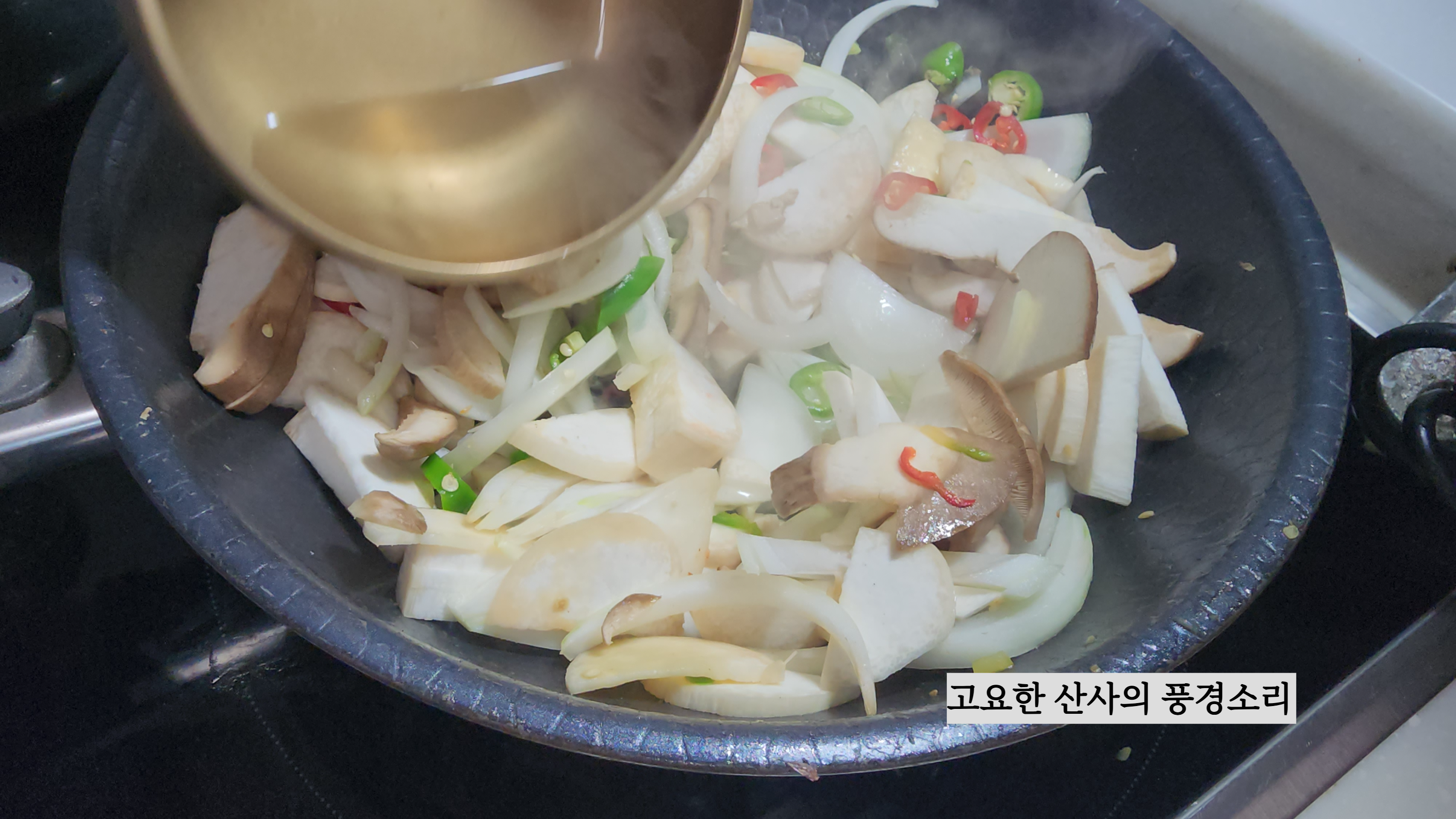 ㉡ 식용유, 마늘, 썰어둔 새송이, 양파, 고추를 넣고 볶아준다.