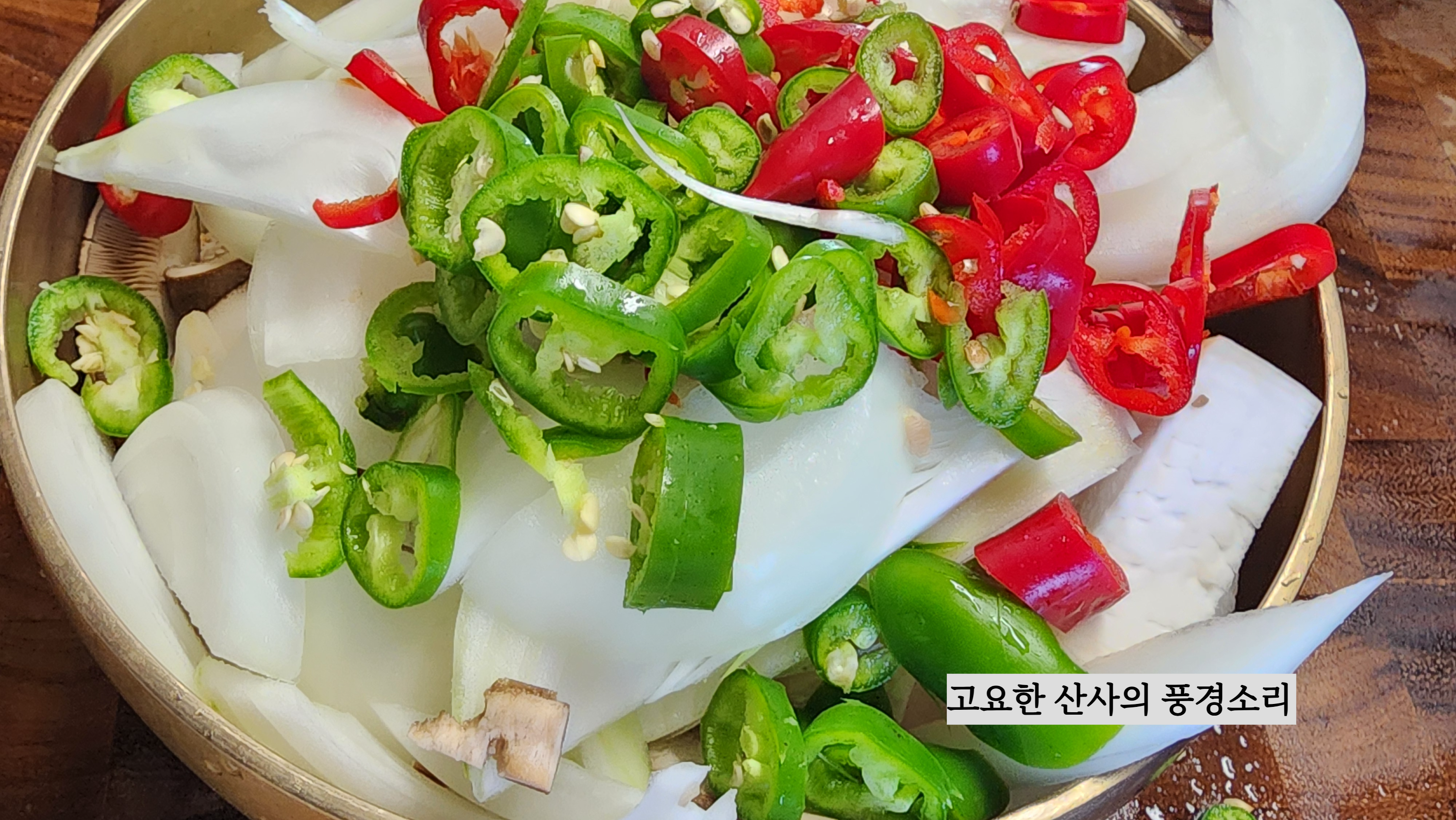 ㉠ 새송이버섯, 양파, 고추는 먹기 좋은 크기로 썰어준다.