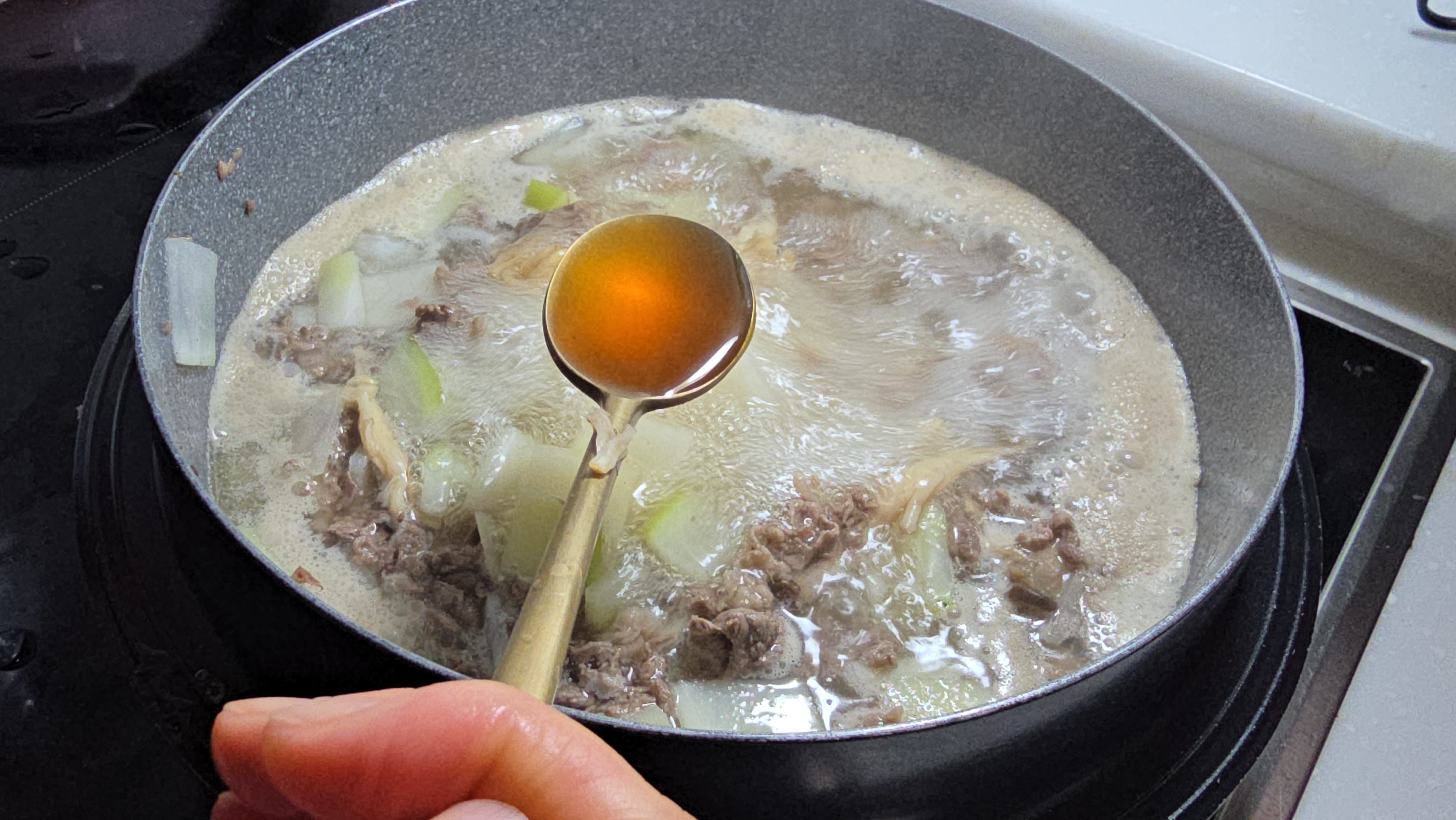 → Season with anchovy fish sauce and skim foam.