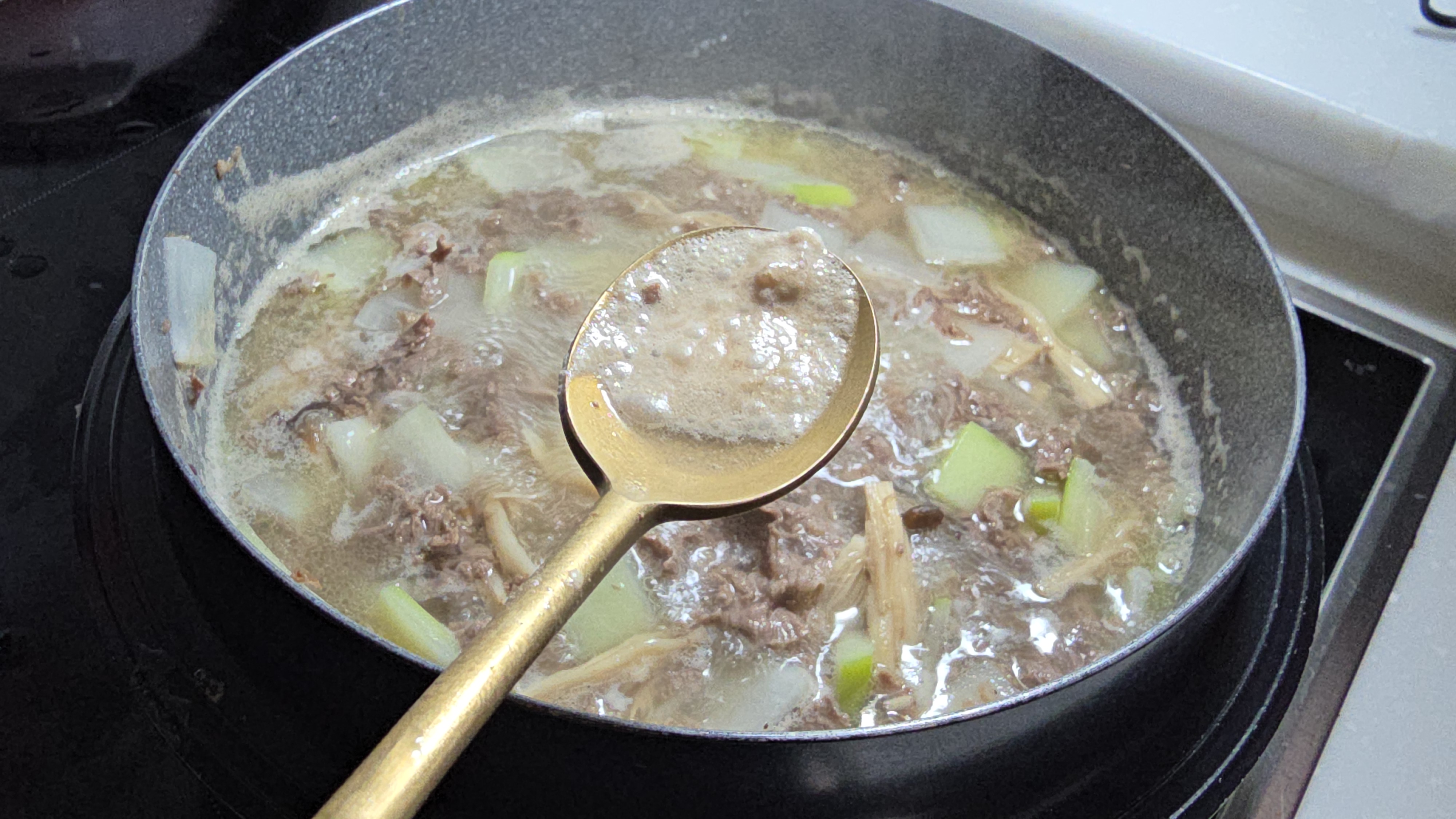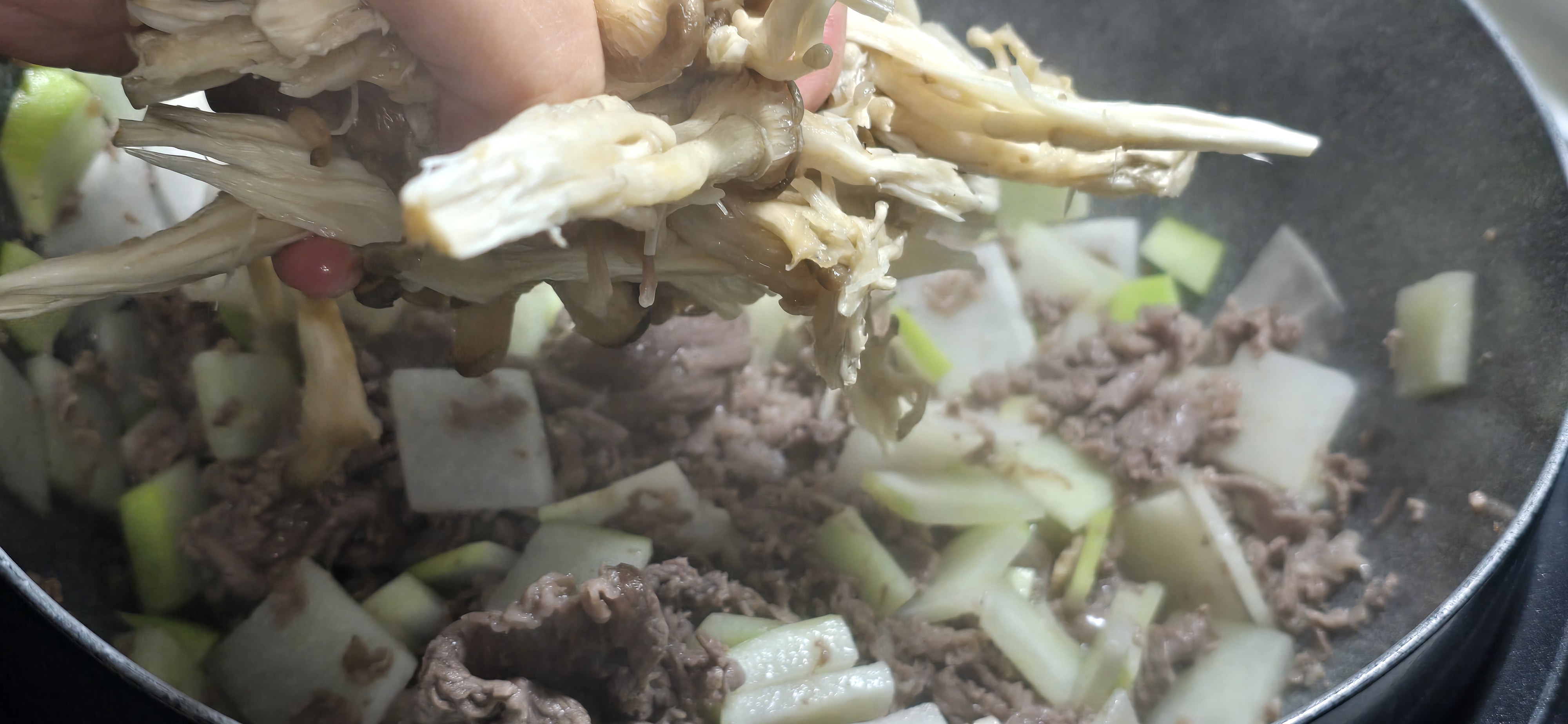 → Add radish and mushrooms once beef is half cooked.