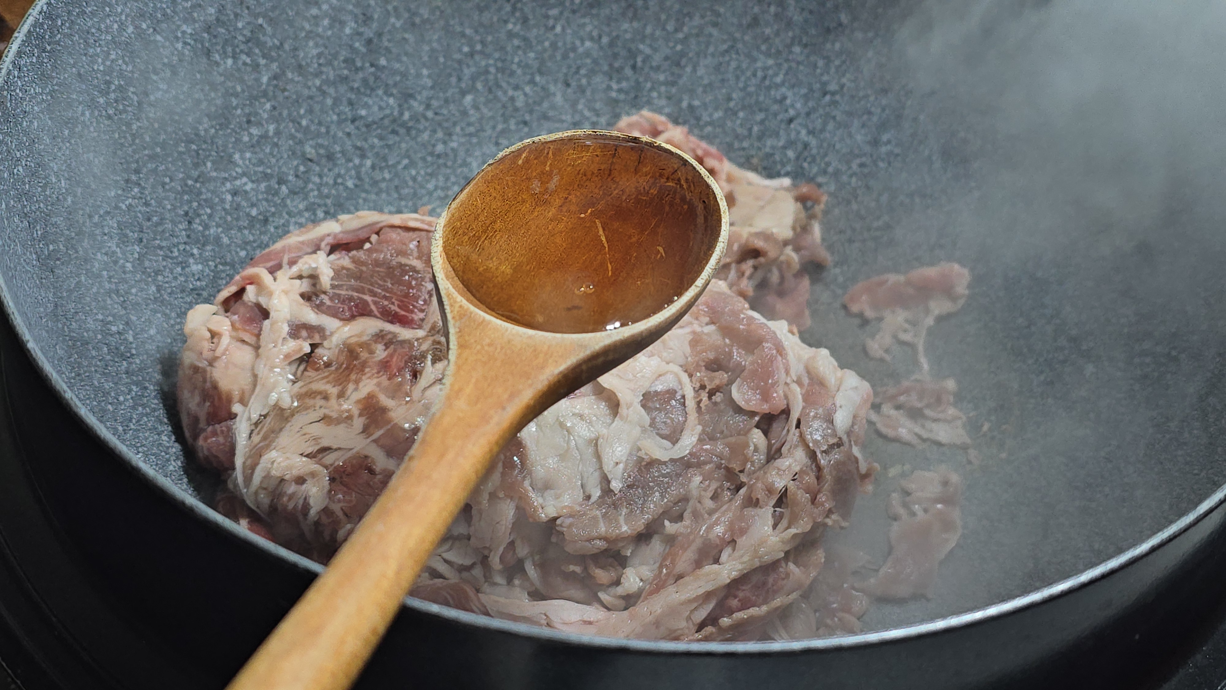볶은 고기에 끓는 육수를 붓는 방식만 지켜도