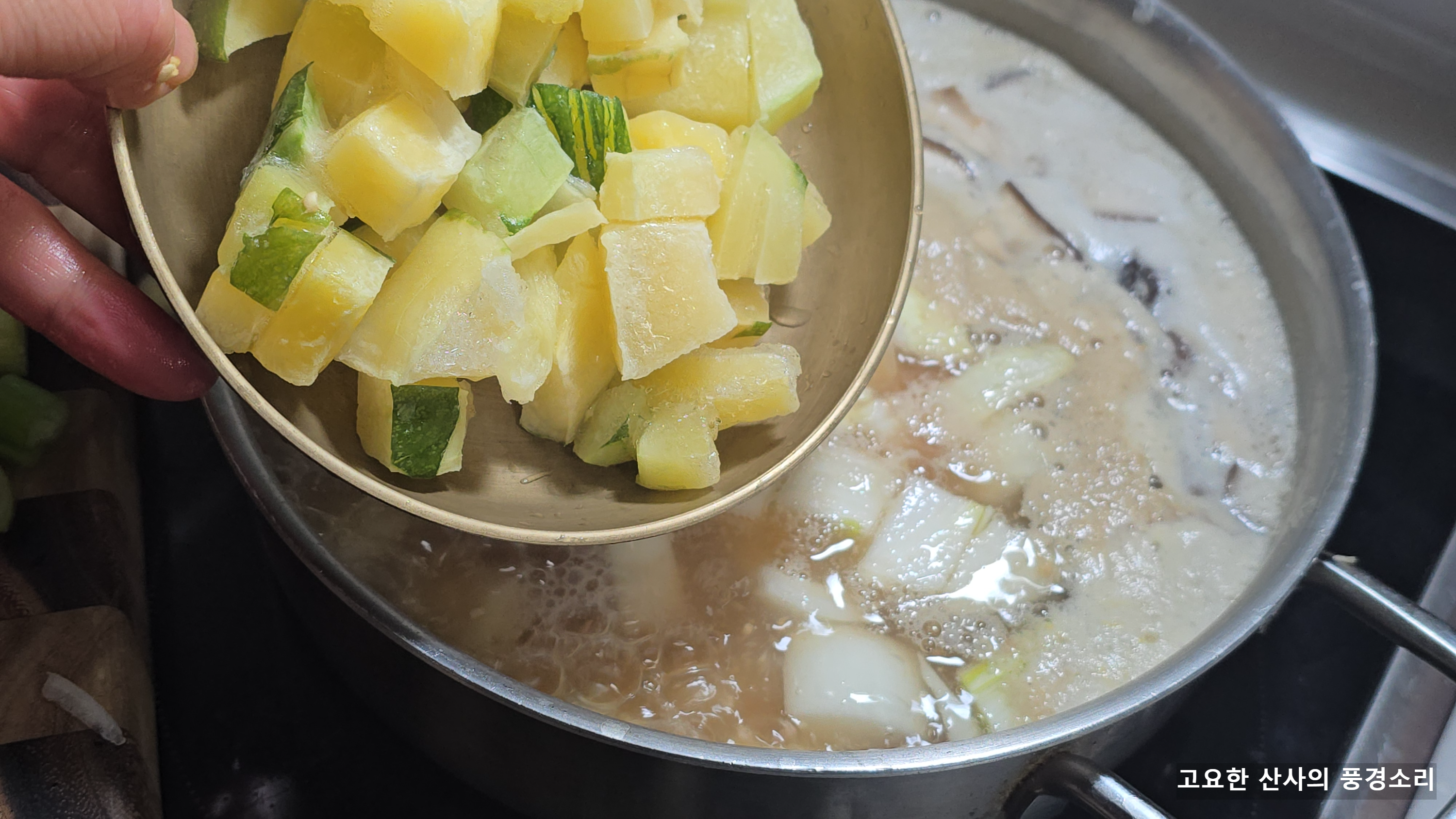 ㉤ 육수가 끓어오르면 감자, 표고버섯, 당근을 먼저 넣고 끓인다.