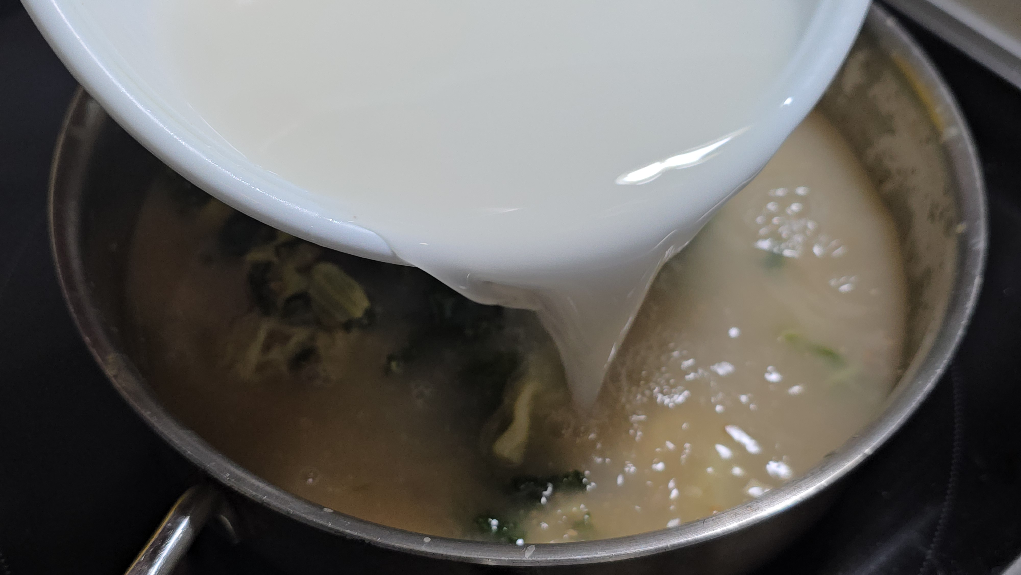 ㉢ 쌀뜨물과 동전육수를 냄비에 넣고 끓인다.