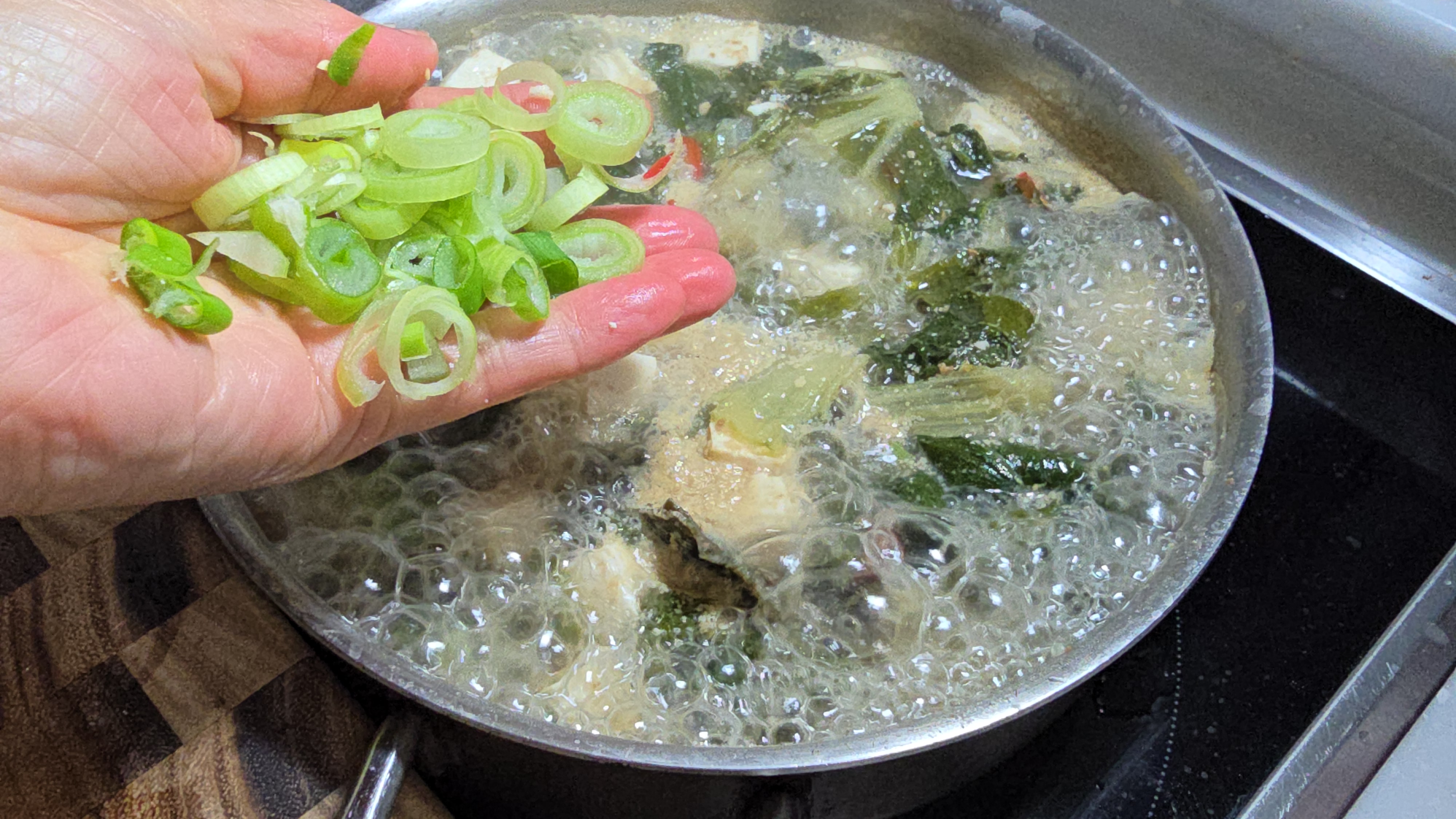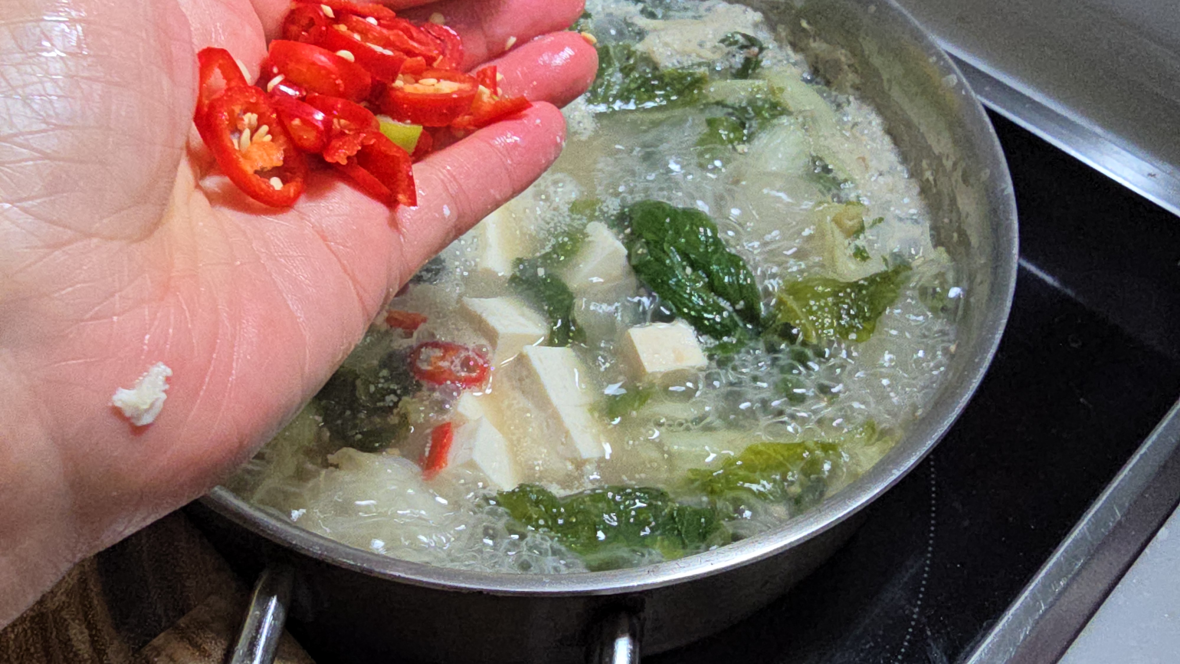 → When the broth starts boiling, add the tofu, red chili, and kelp.