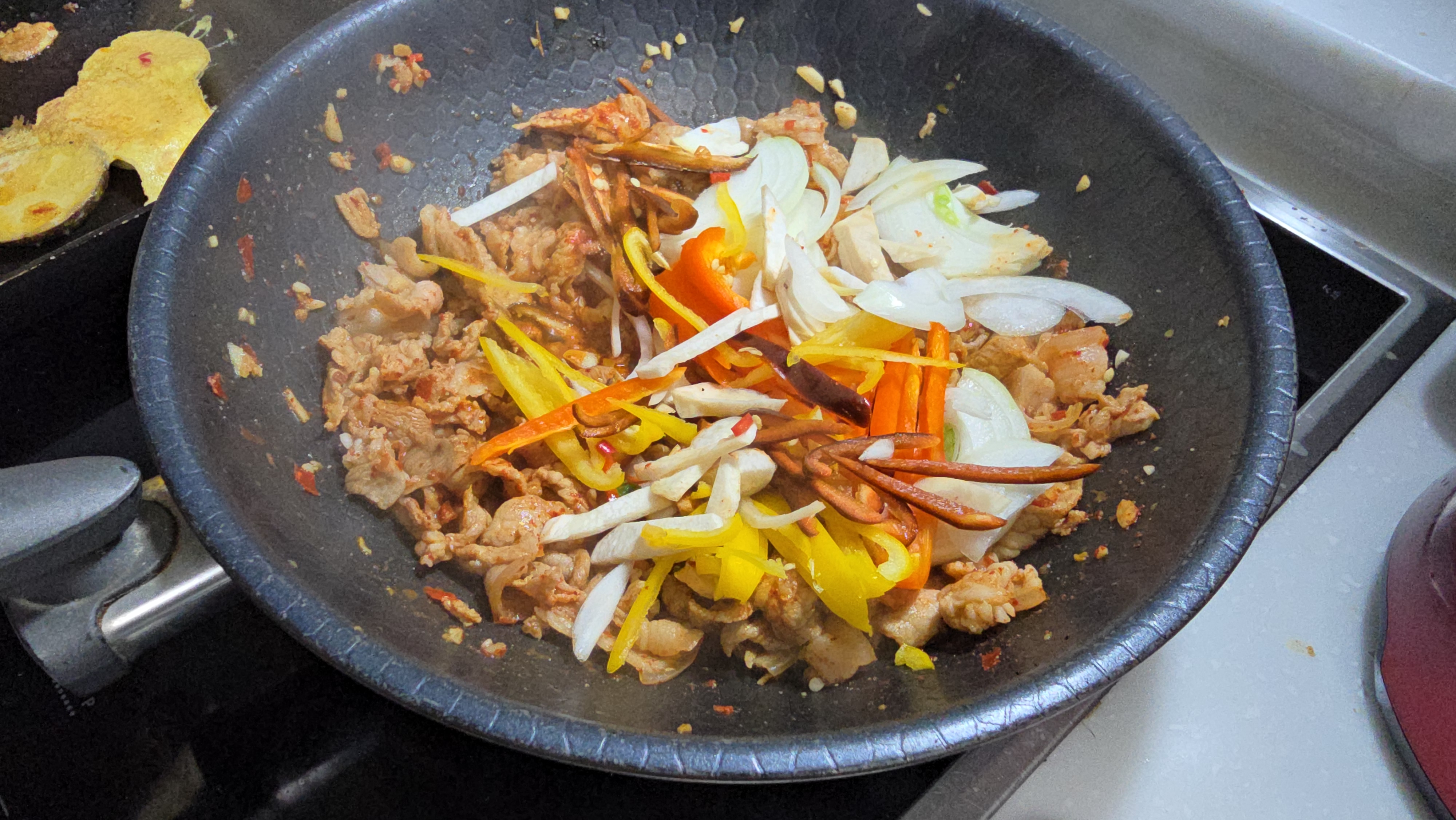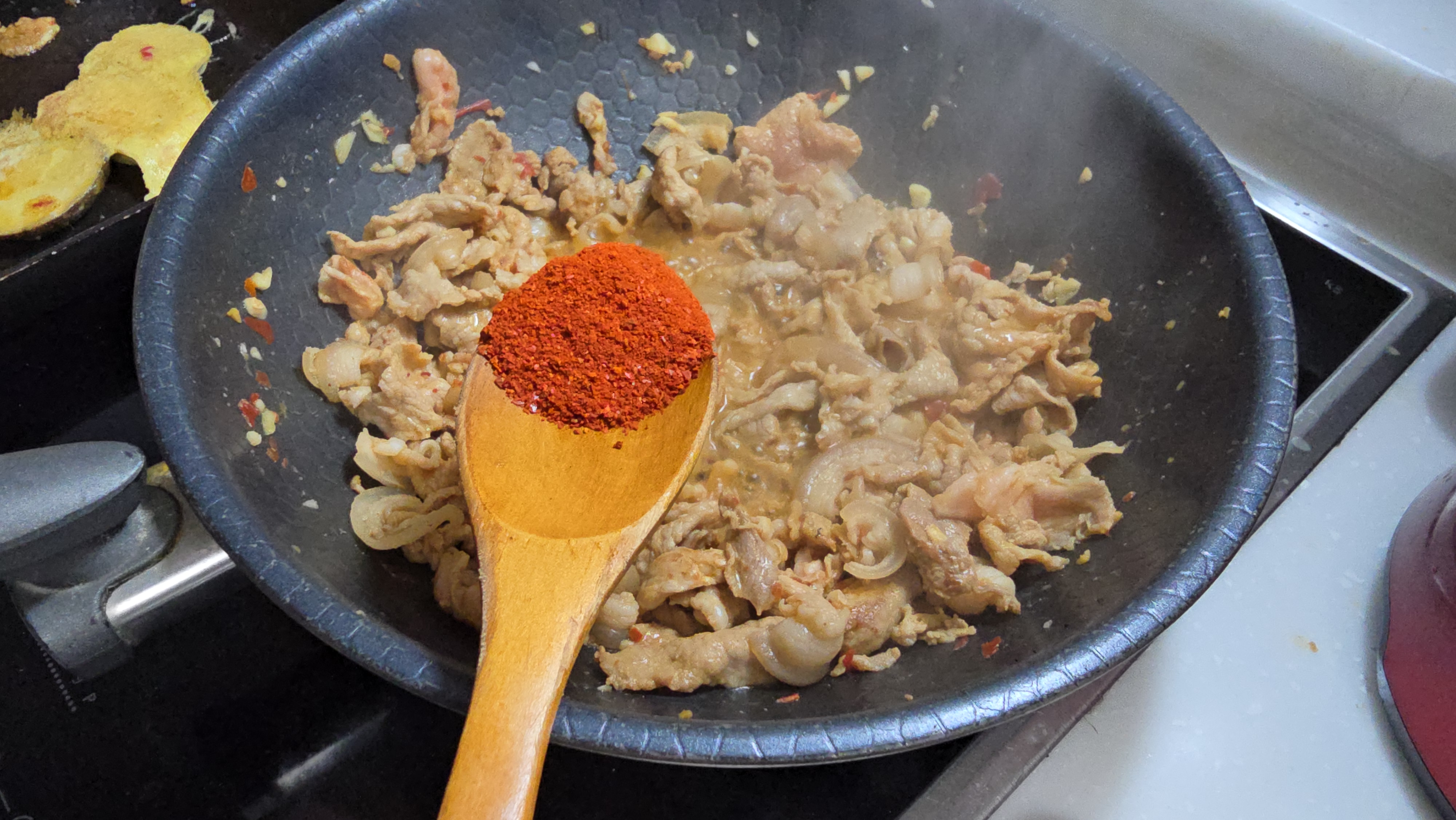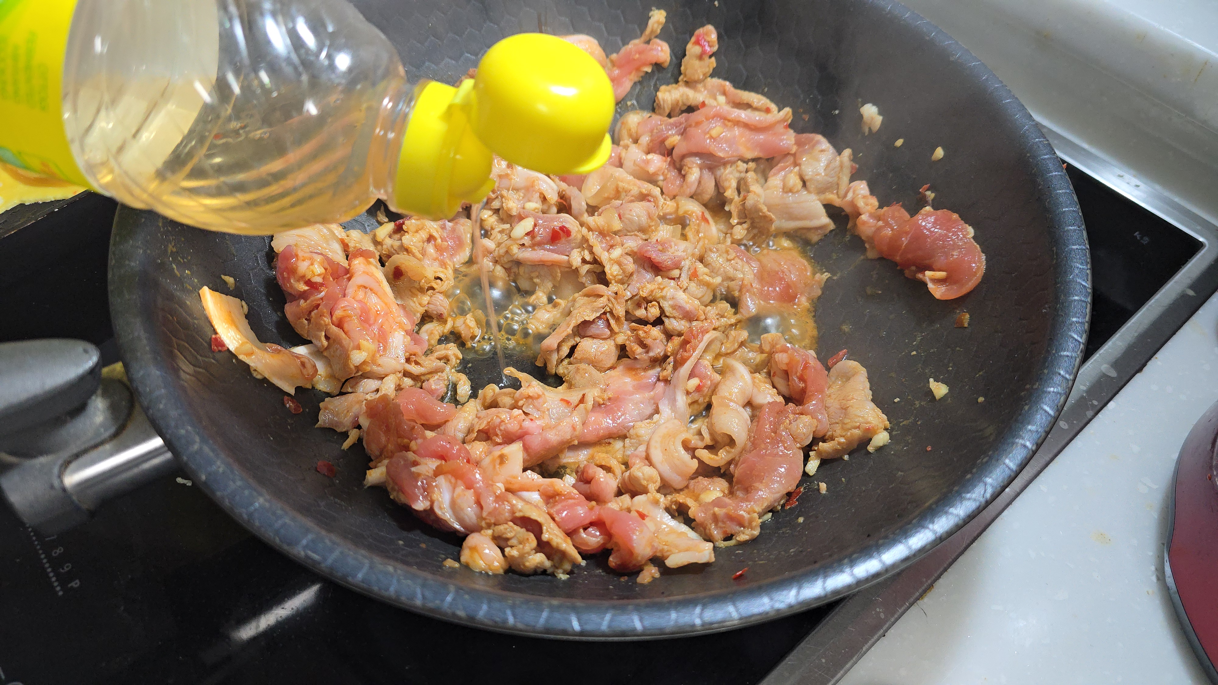 → Add water, cooking wine, and red pepper powder, then stir-fry.