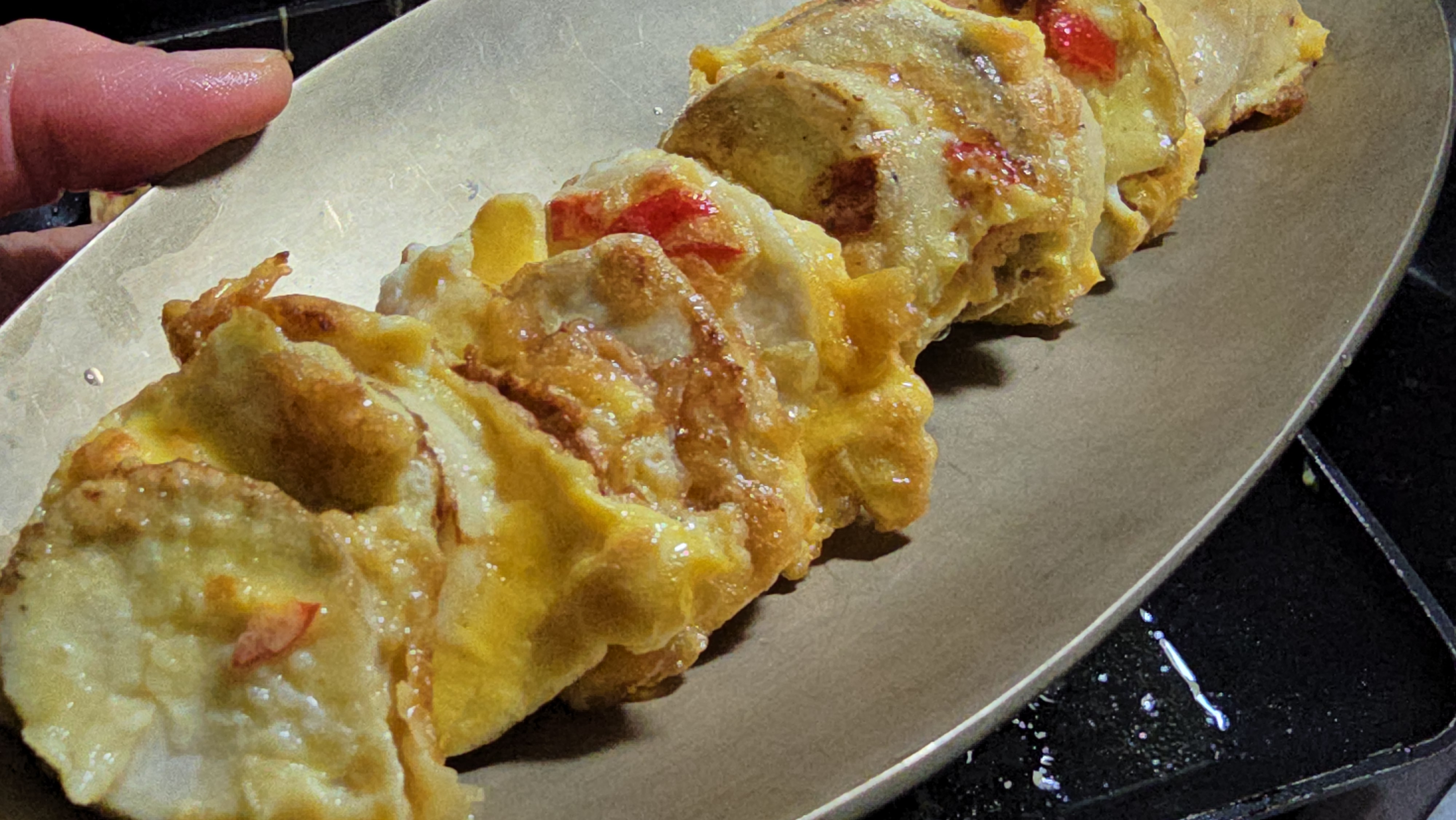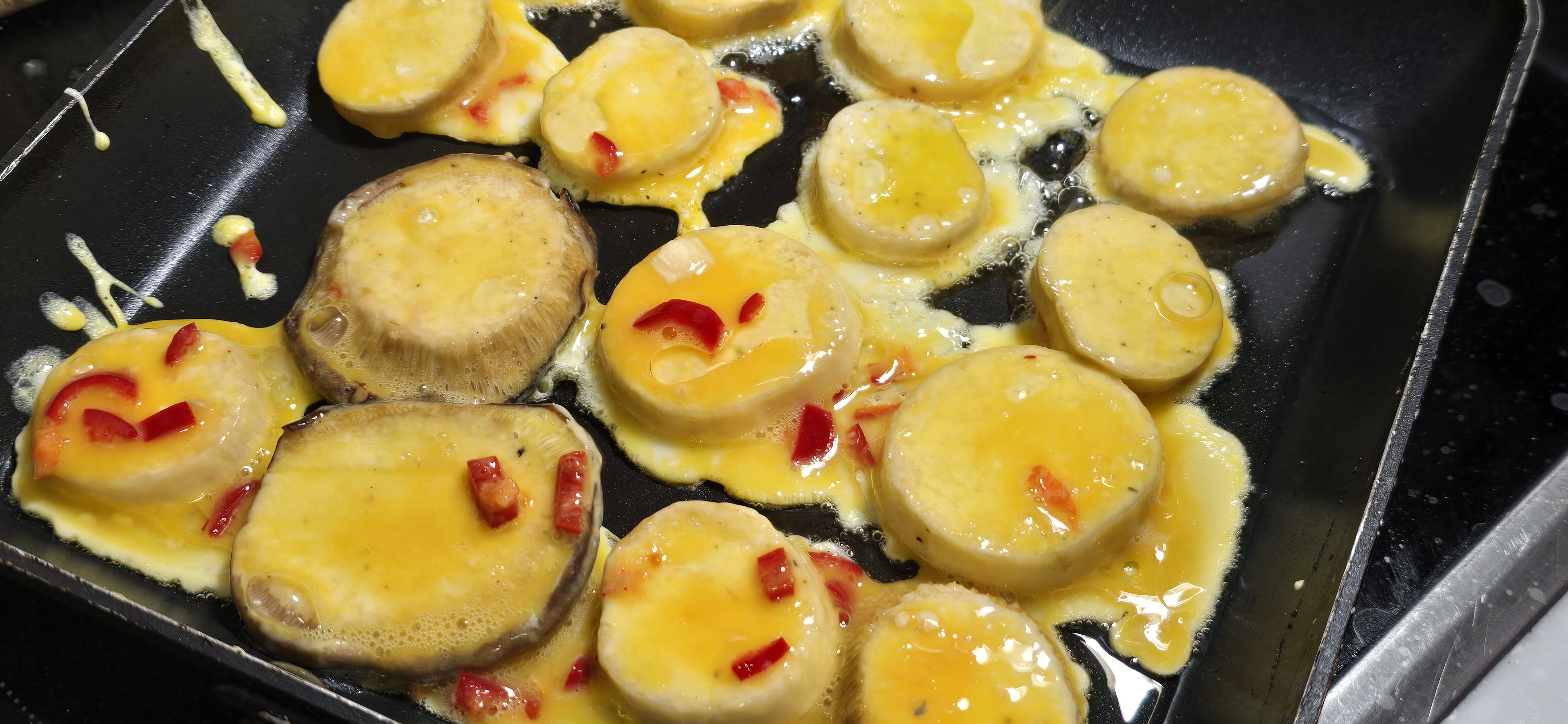 → Heat oil in a pan, dip the mushrooms in egg, and place them in the pan.