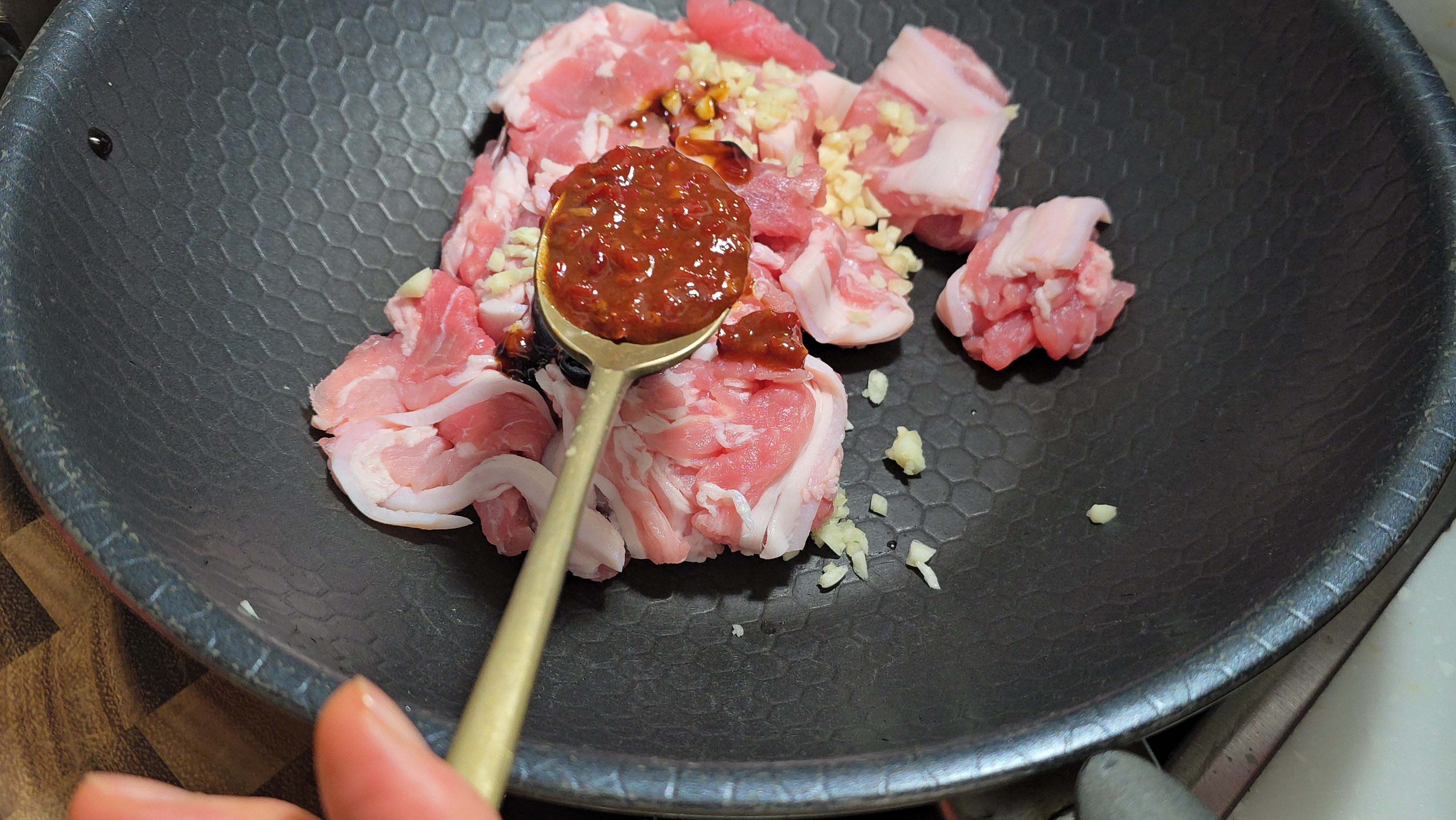 → Mix the pork with minced garlic and doubanjiang to marinate.