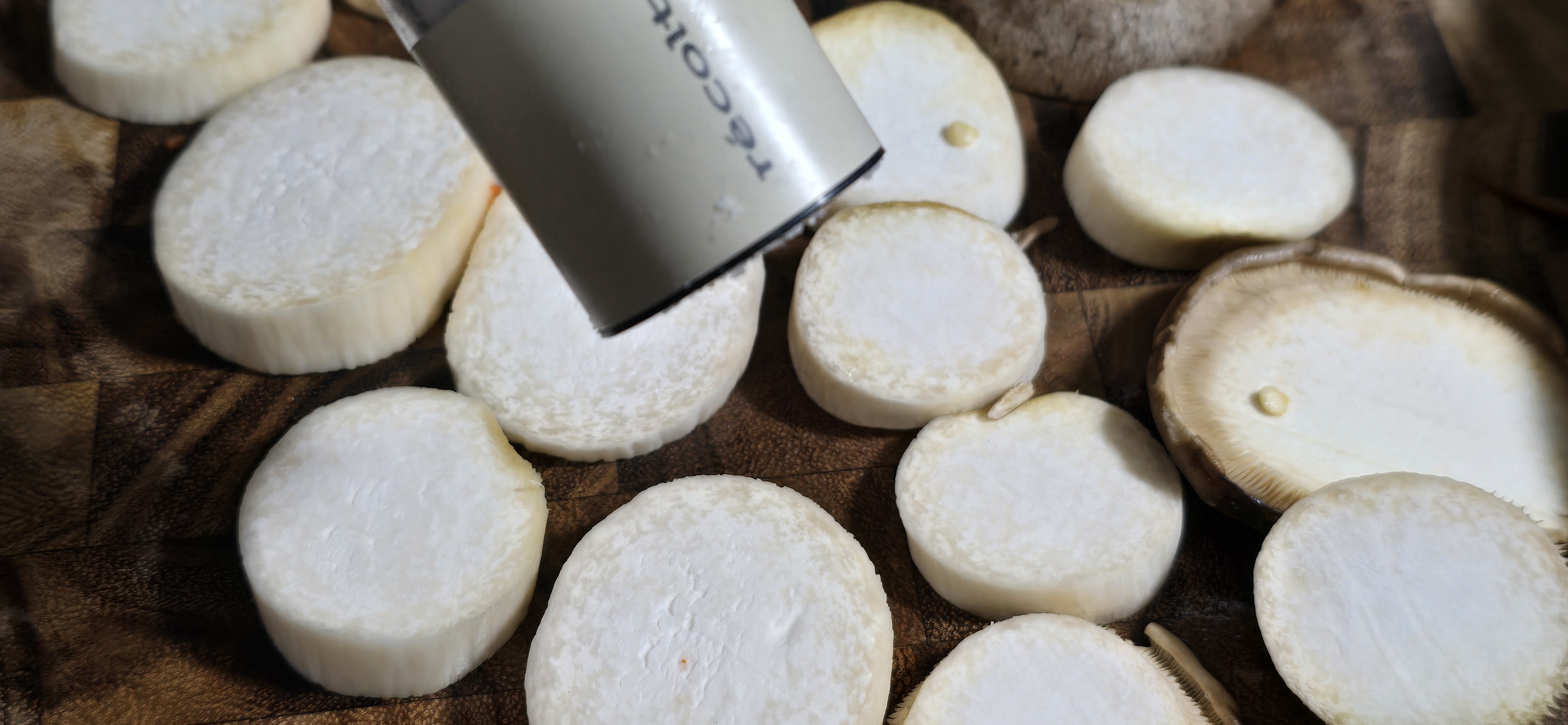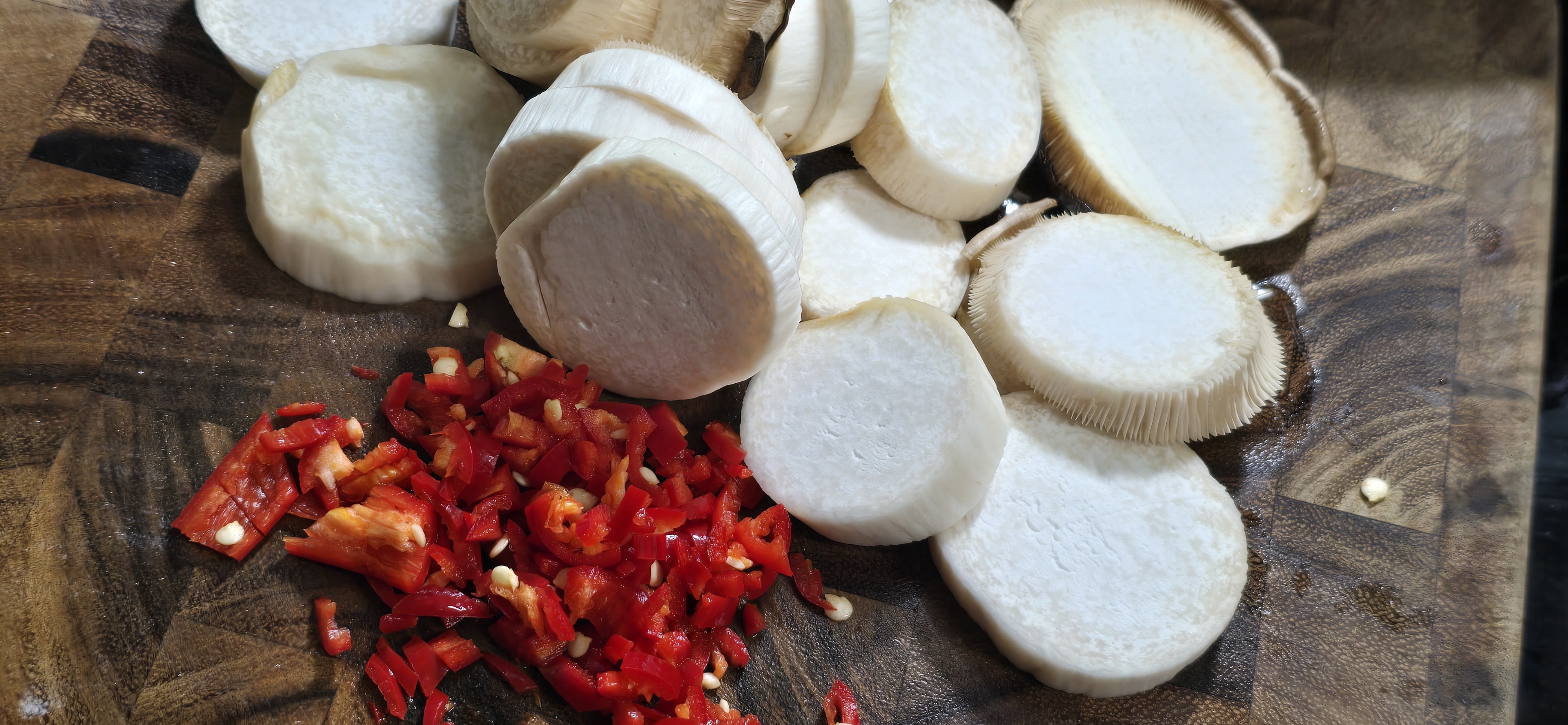 → Slice the king oyster mushrooms thickly and finely chop the red chili.