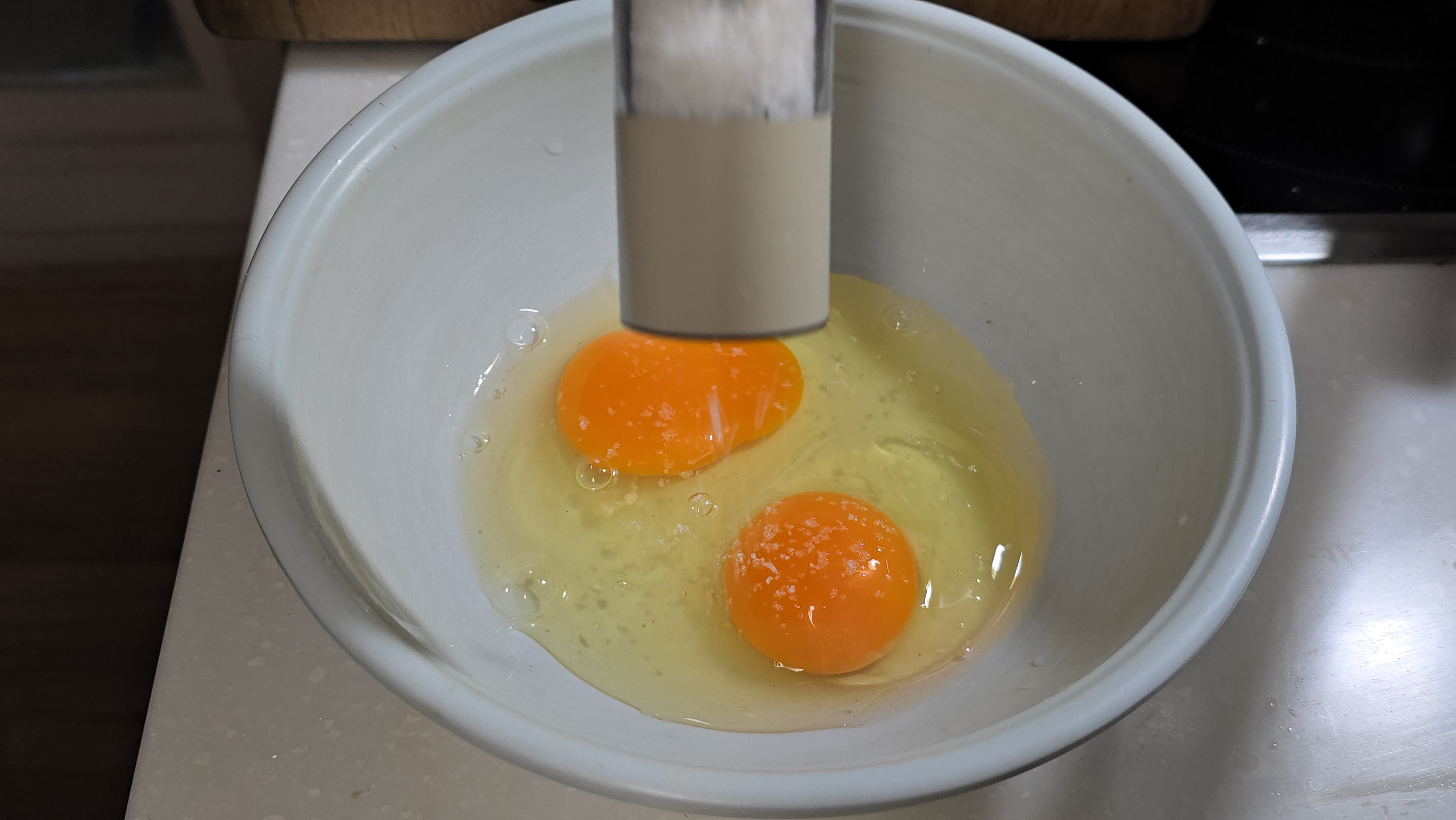 → Add salt and chopped red chili to the eggs, then beat well.