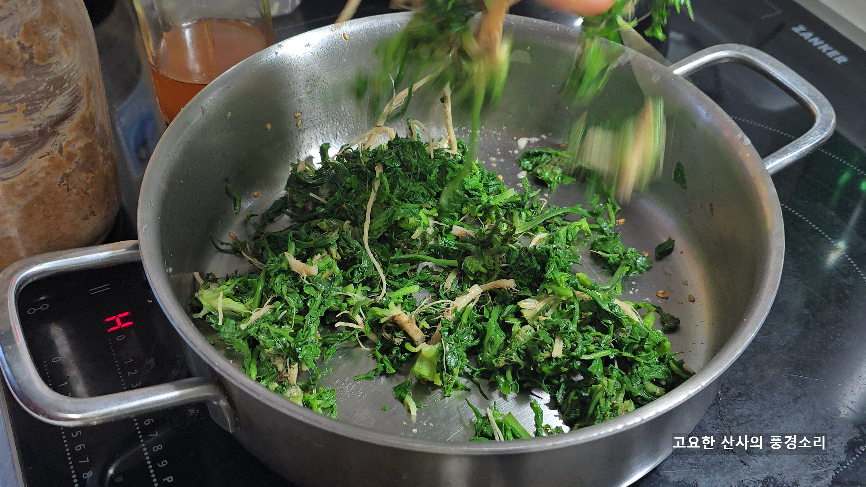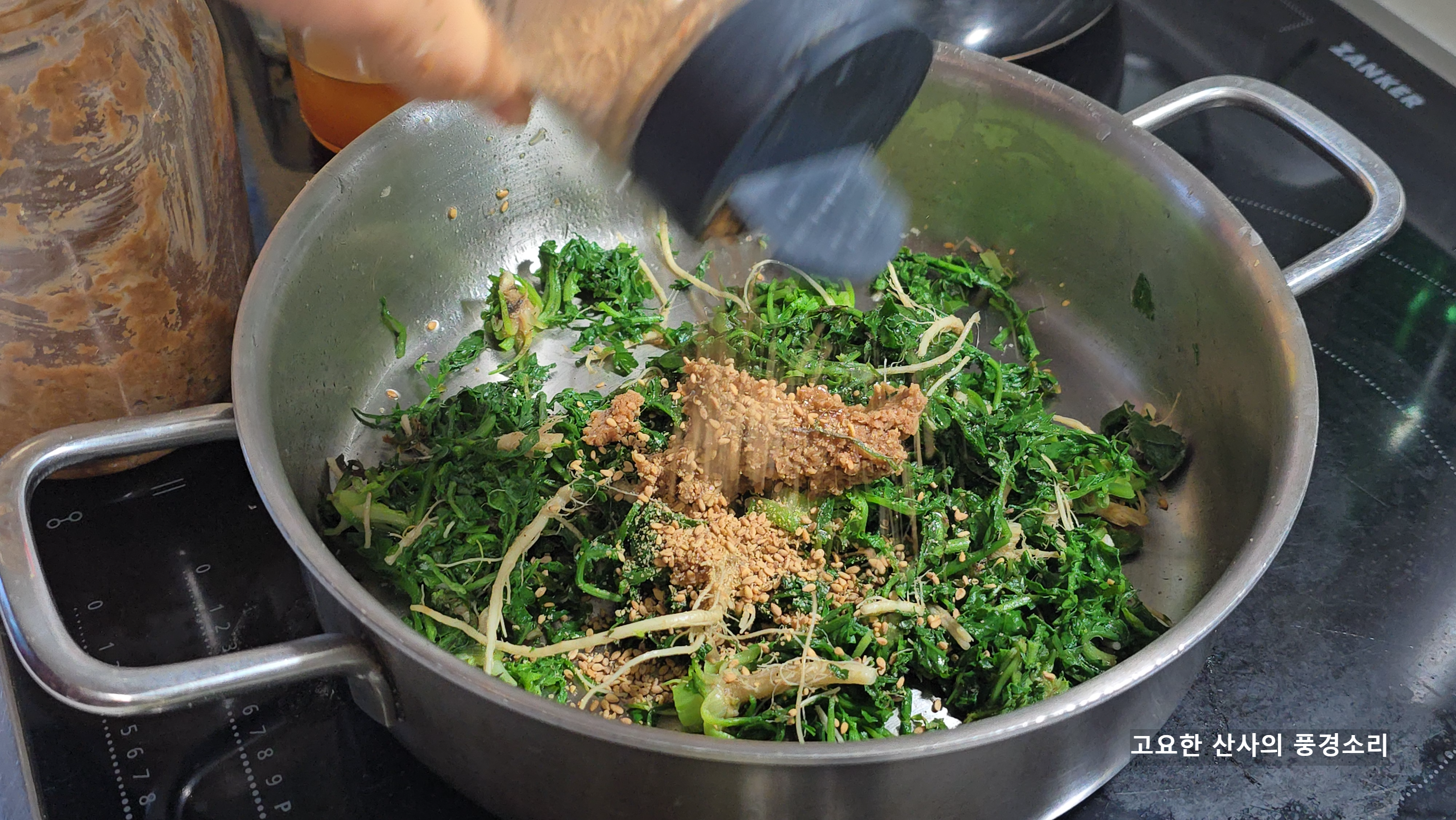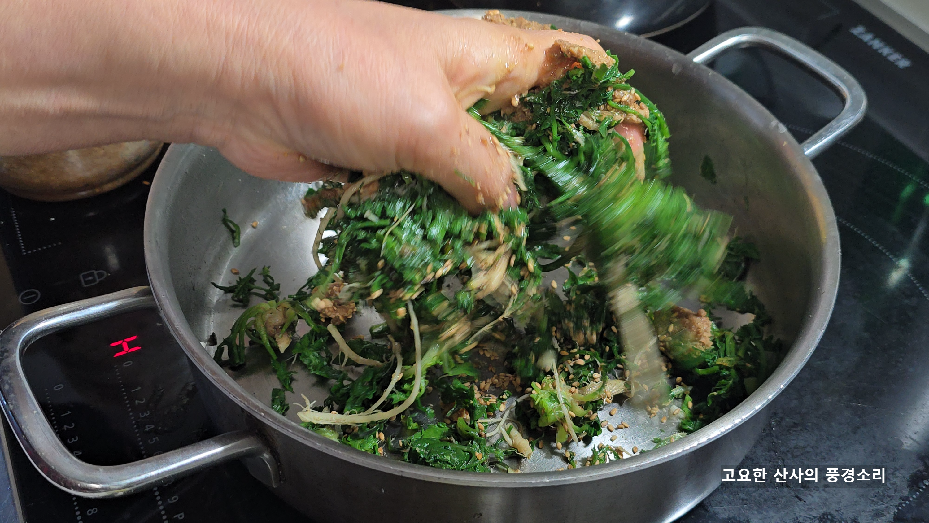 ㉡ 된장, 참기름, 깨소금을 넣고 조물조물 무친다.