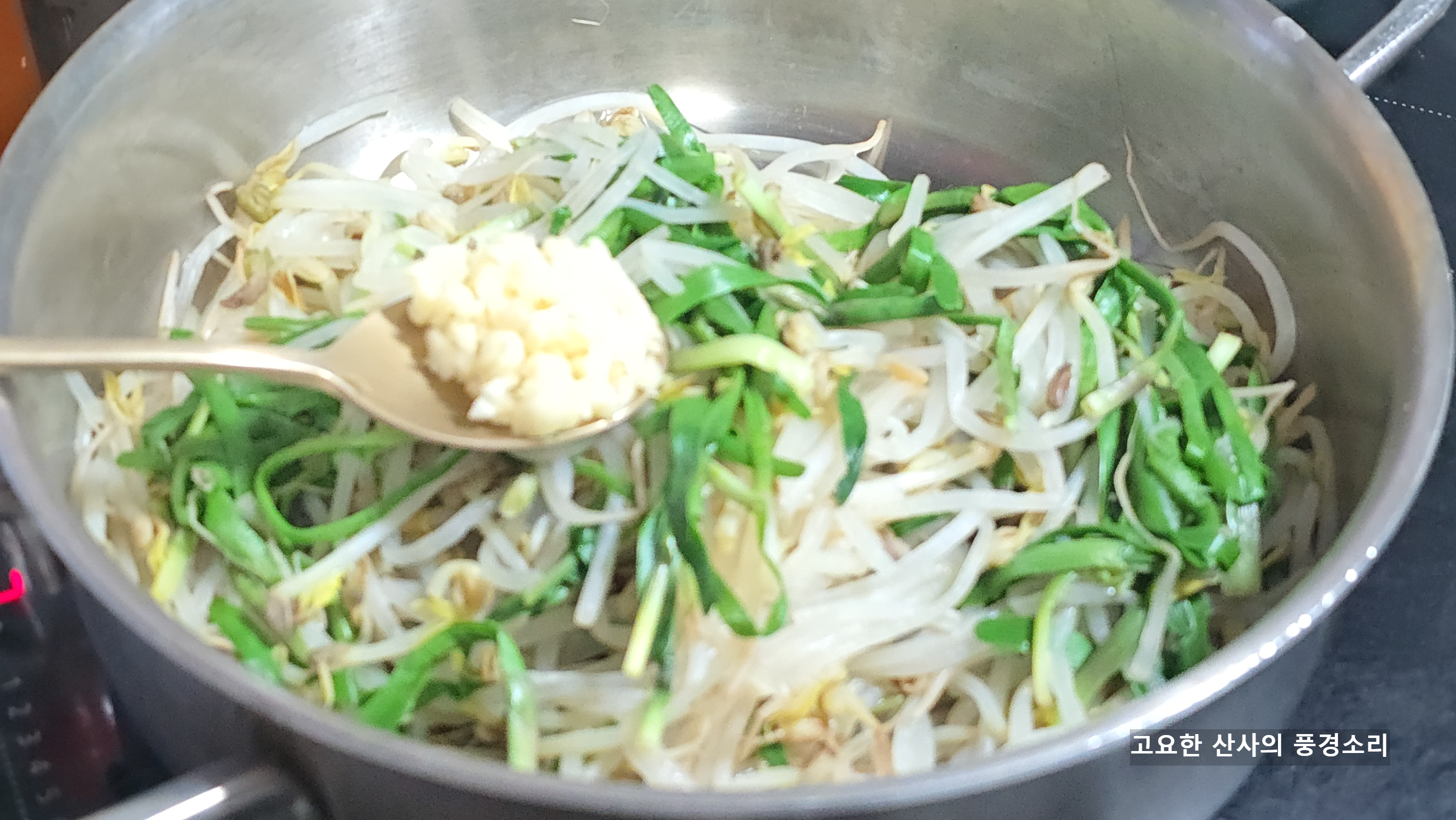 ㉠ 물 1/2컵과 숙주를 냄비에 넣고 초벌부추를 올려 삶아준다.