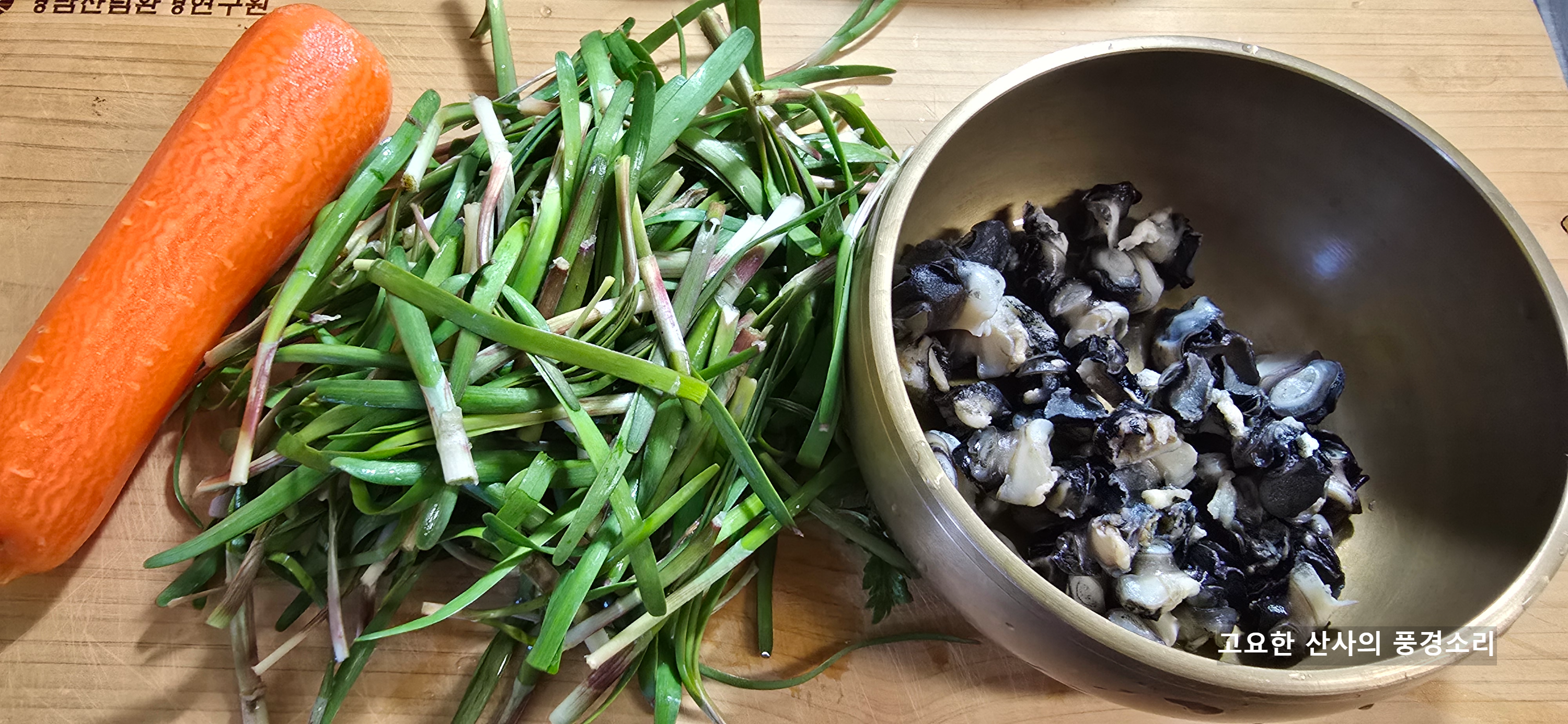 ㉠ 초벌부추와 당근을 먹기 좋은 크기로 썰어준다.