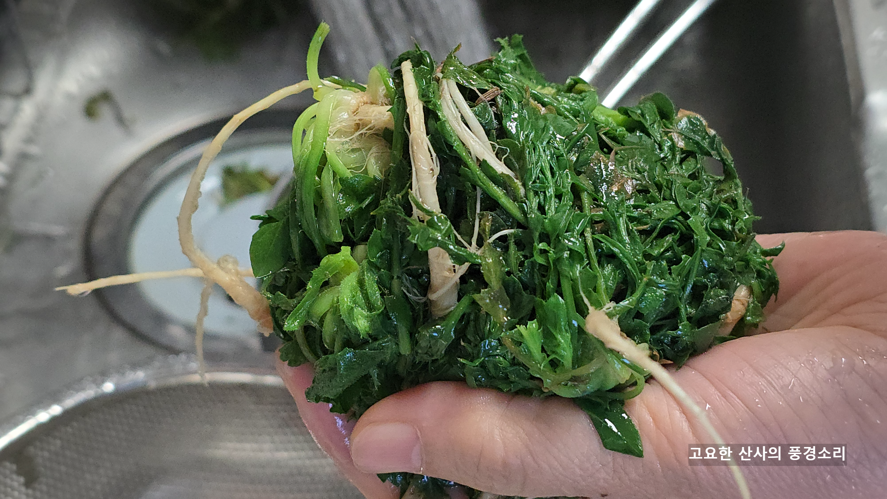㉣ 끓는 물에 굵은소금(Coarse salt)을 넣고 냉이를 데쳐낸다.
