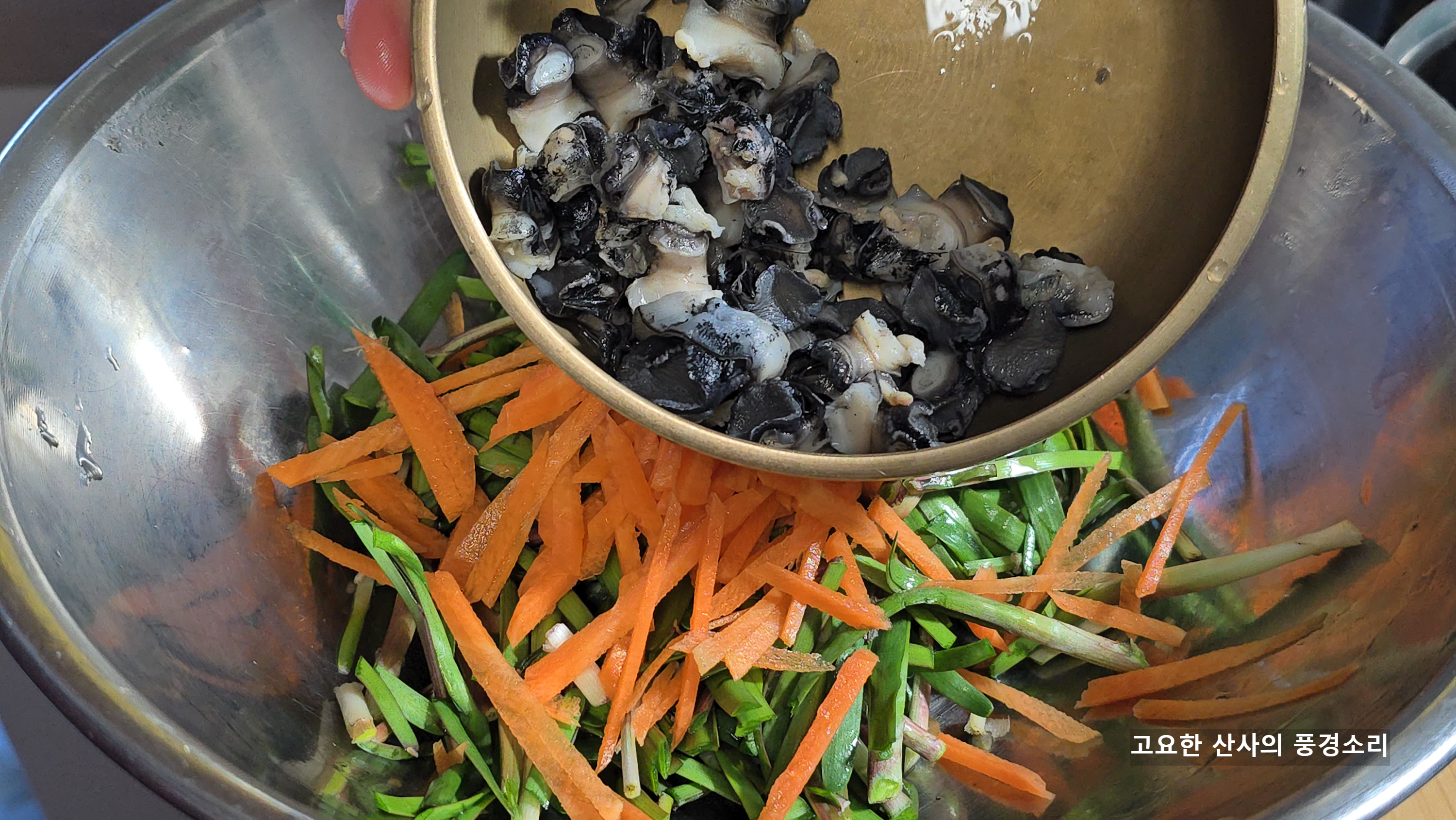 ㉡ 볼에 채소와 씻은 우렁이살을 담고 액젓을 넣는다.