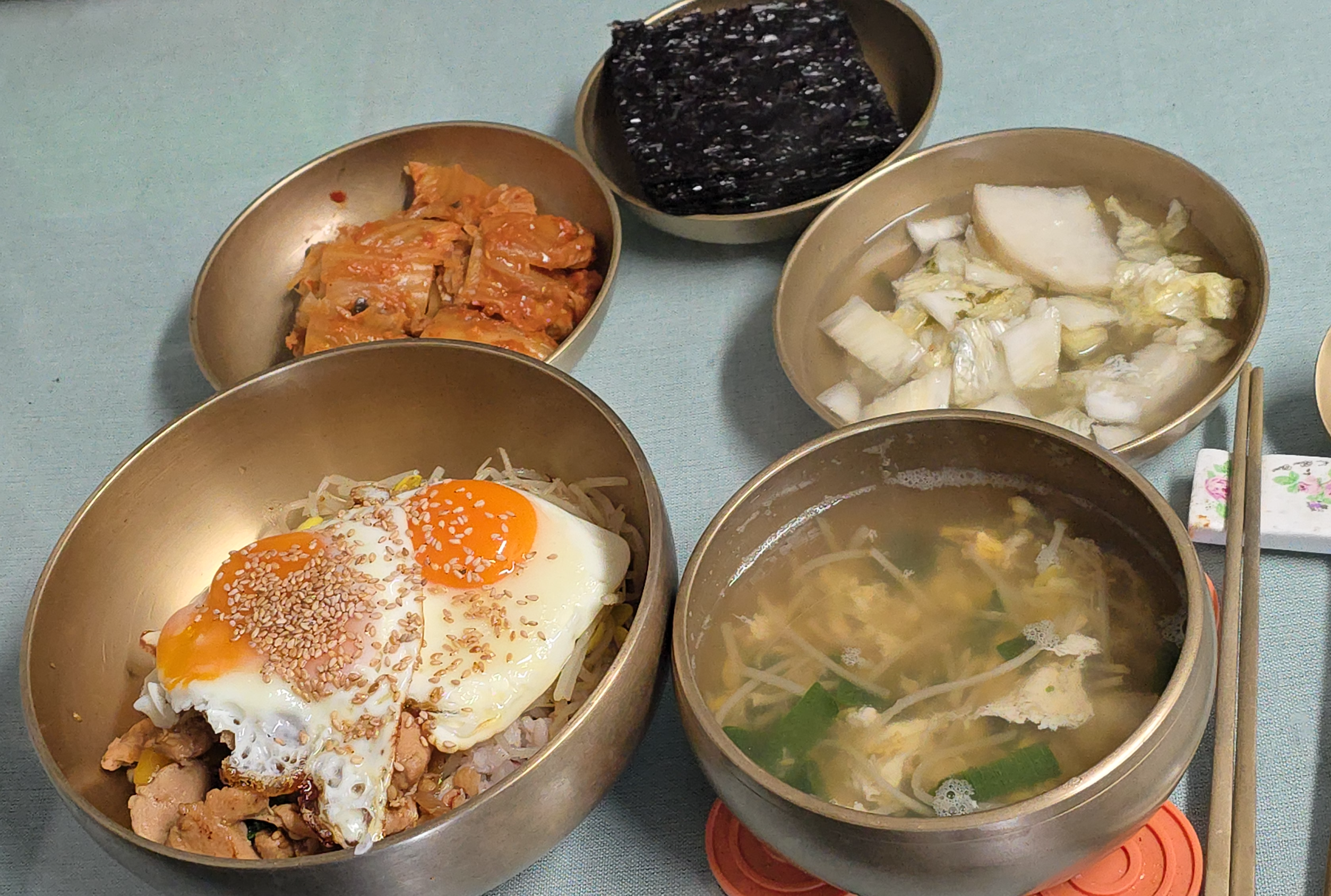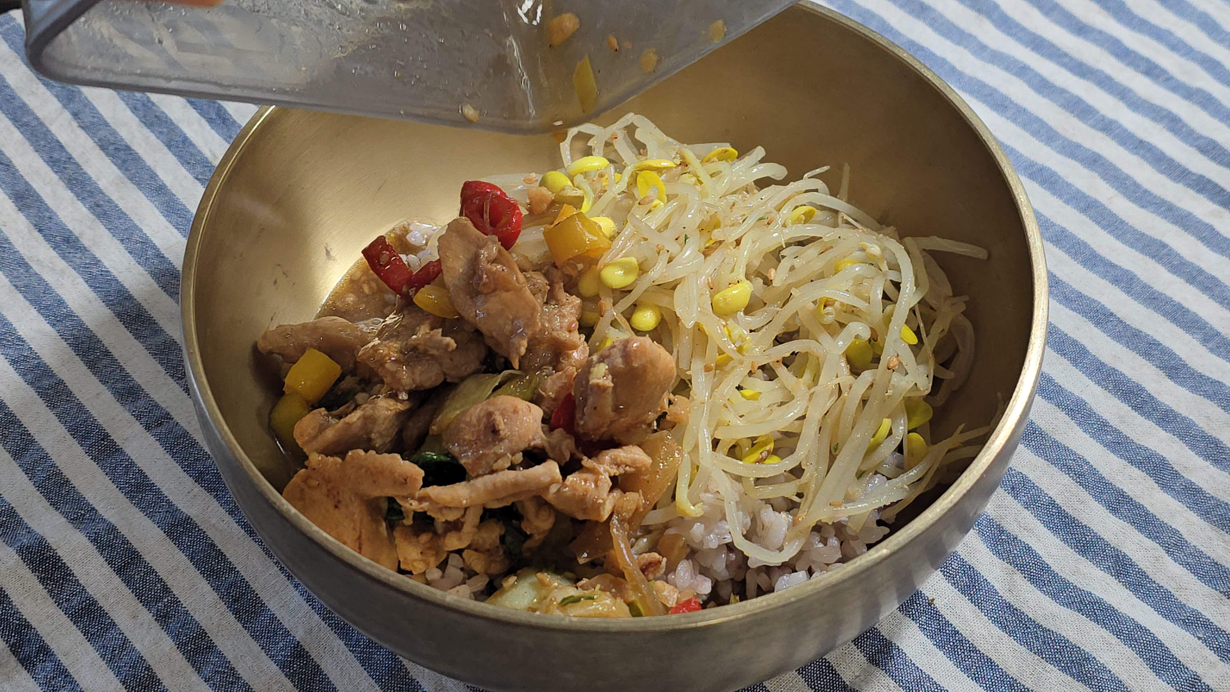 ㉡ 밥 위에 콩나물과 닭살채소볶음, 계란부침을 올려준다.