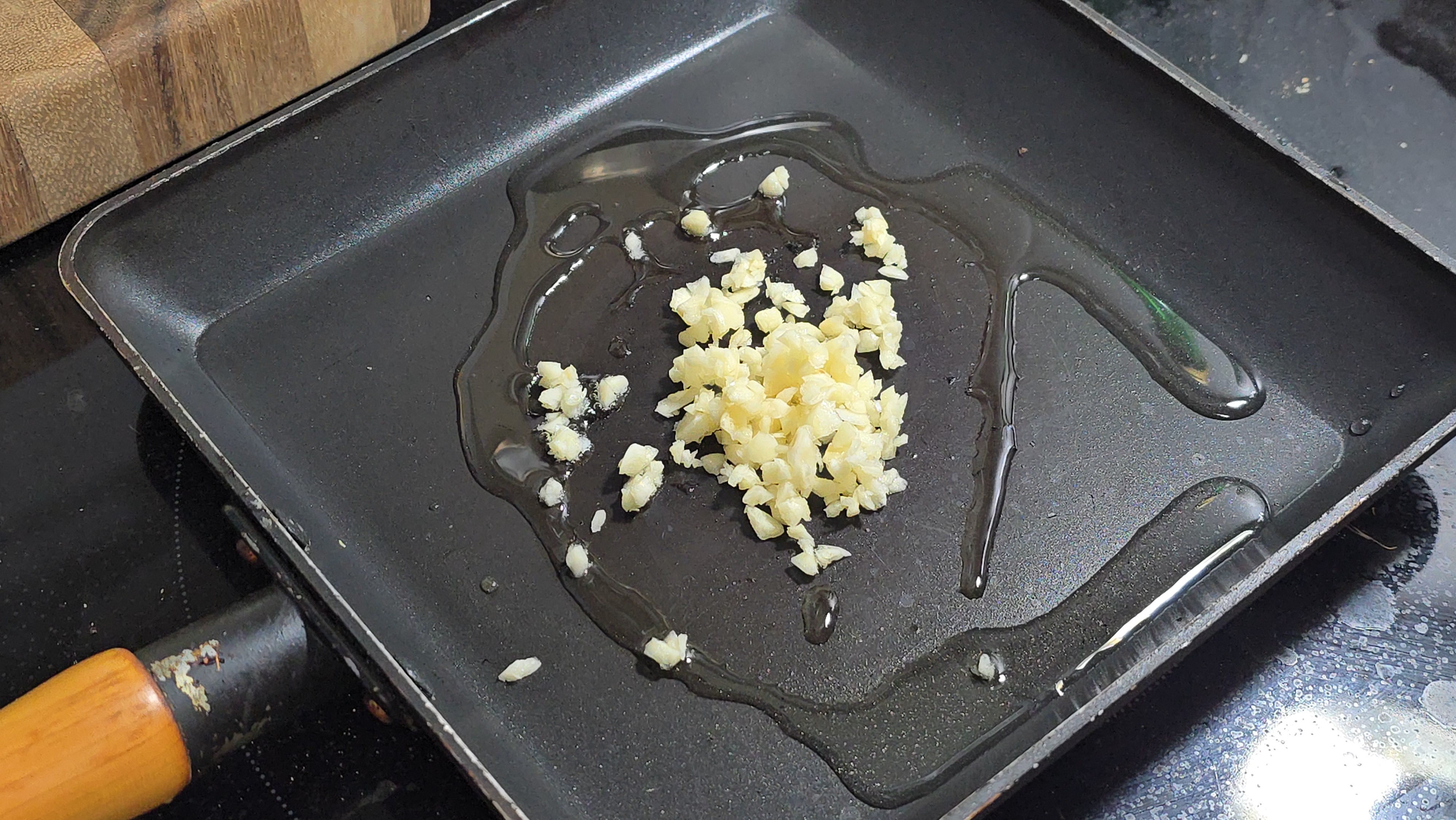 ㉡ 식용유를 두르고 마늘을 먼저 볶아준다.
