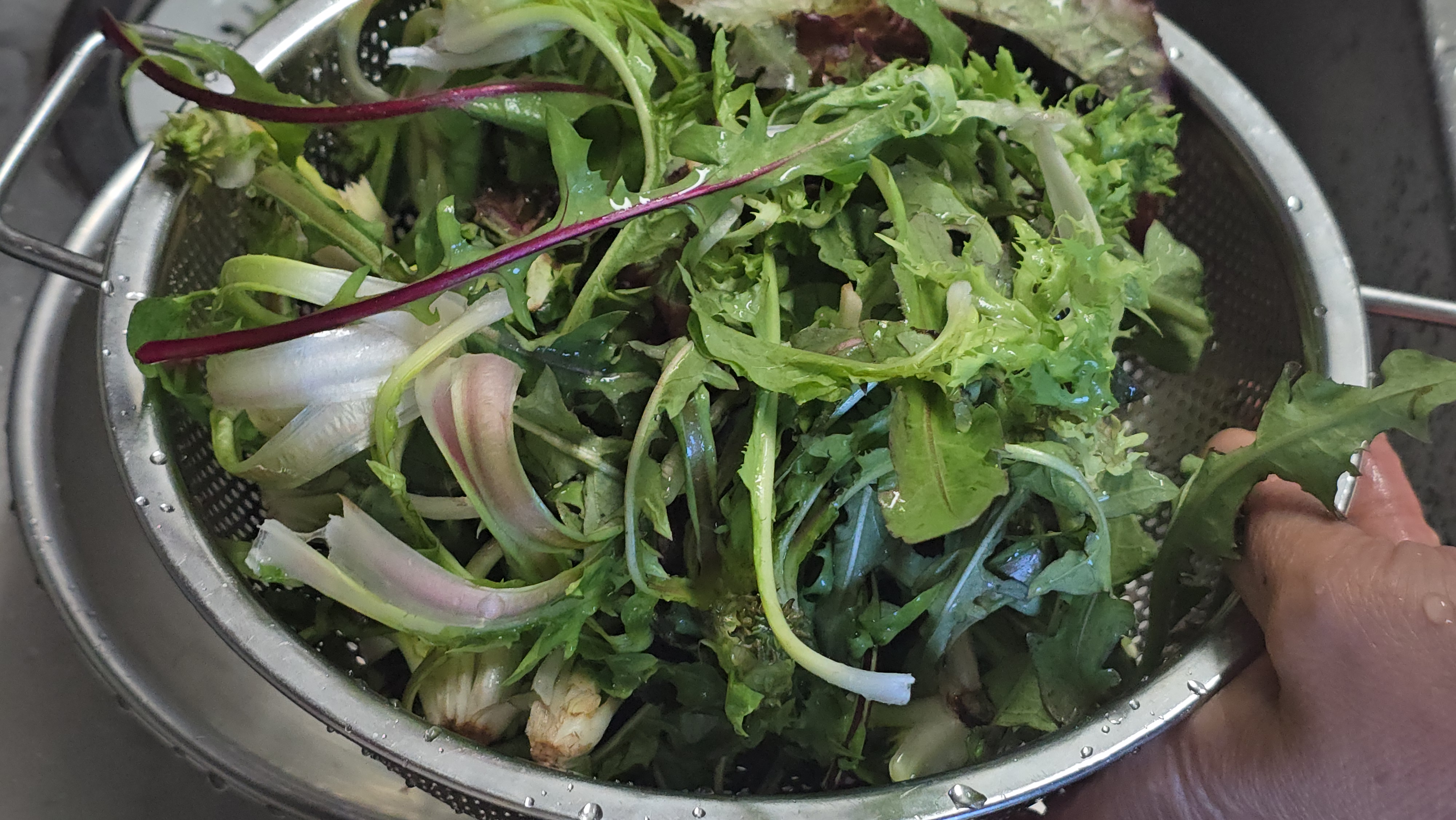 ㉠ 민들레와 상추는 이물질을 제거한 후 깨끗하게 씻어 물기를 제거해 둔다.