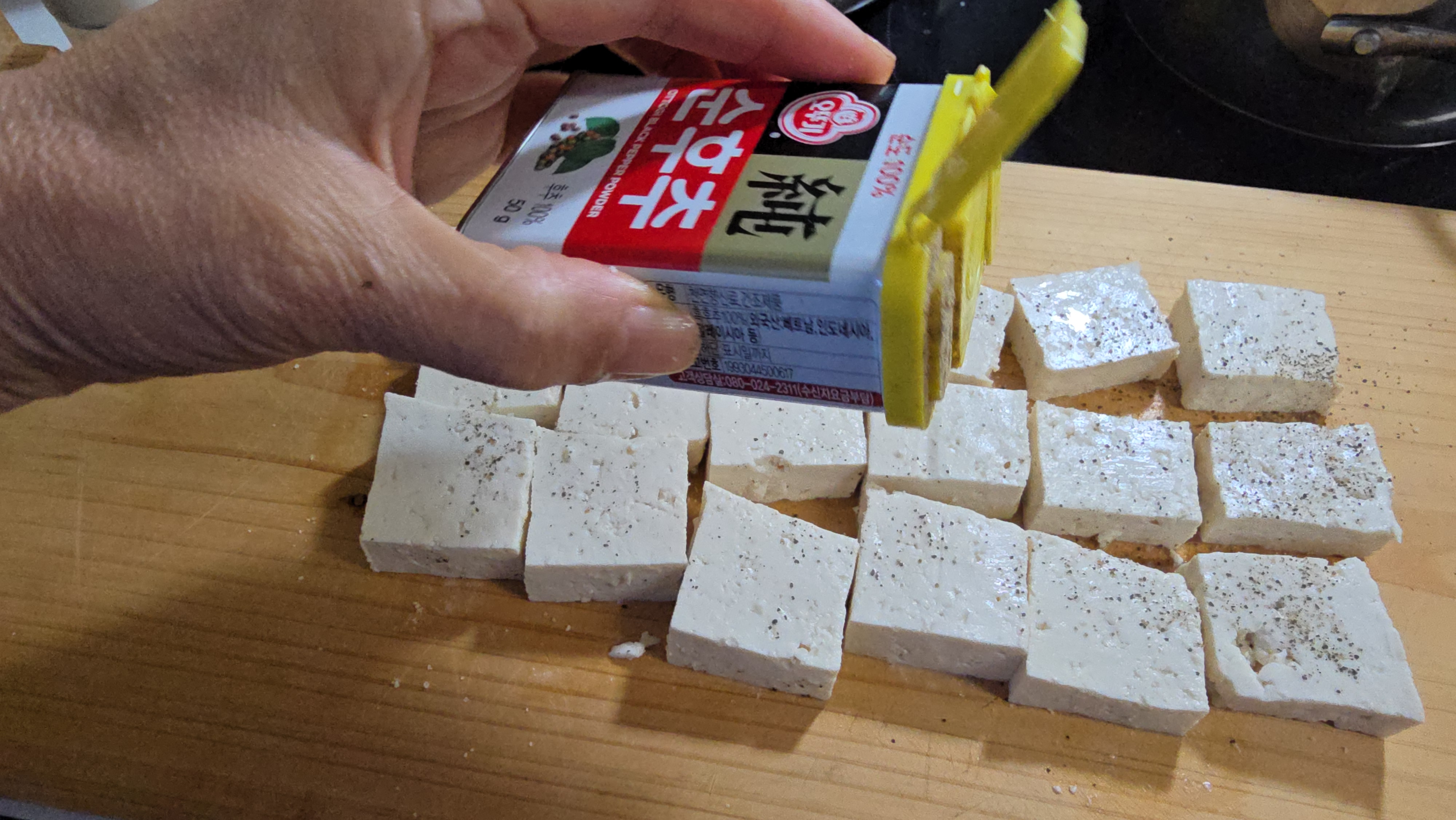 ㉡ 두부는 물기를 제거한 후 먹기 좋은 크기로 썰어준다.