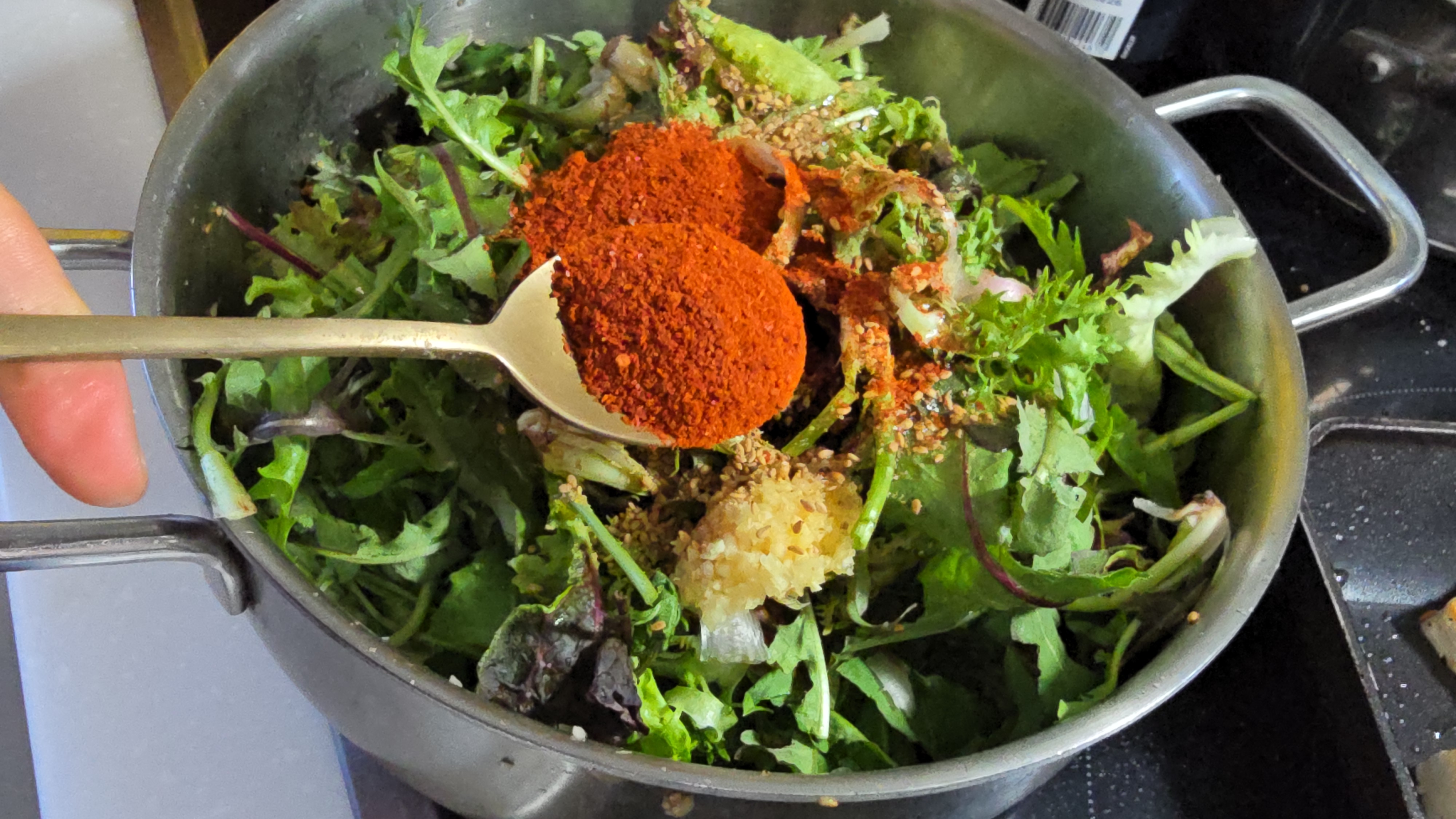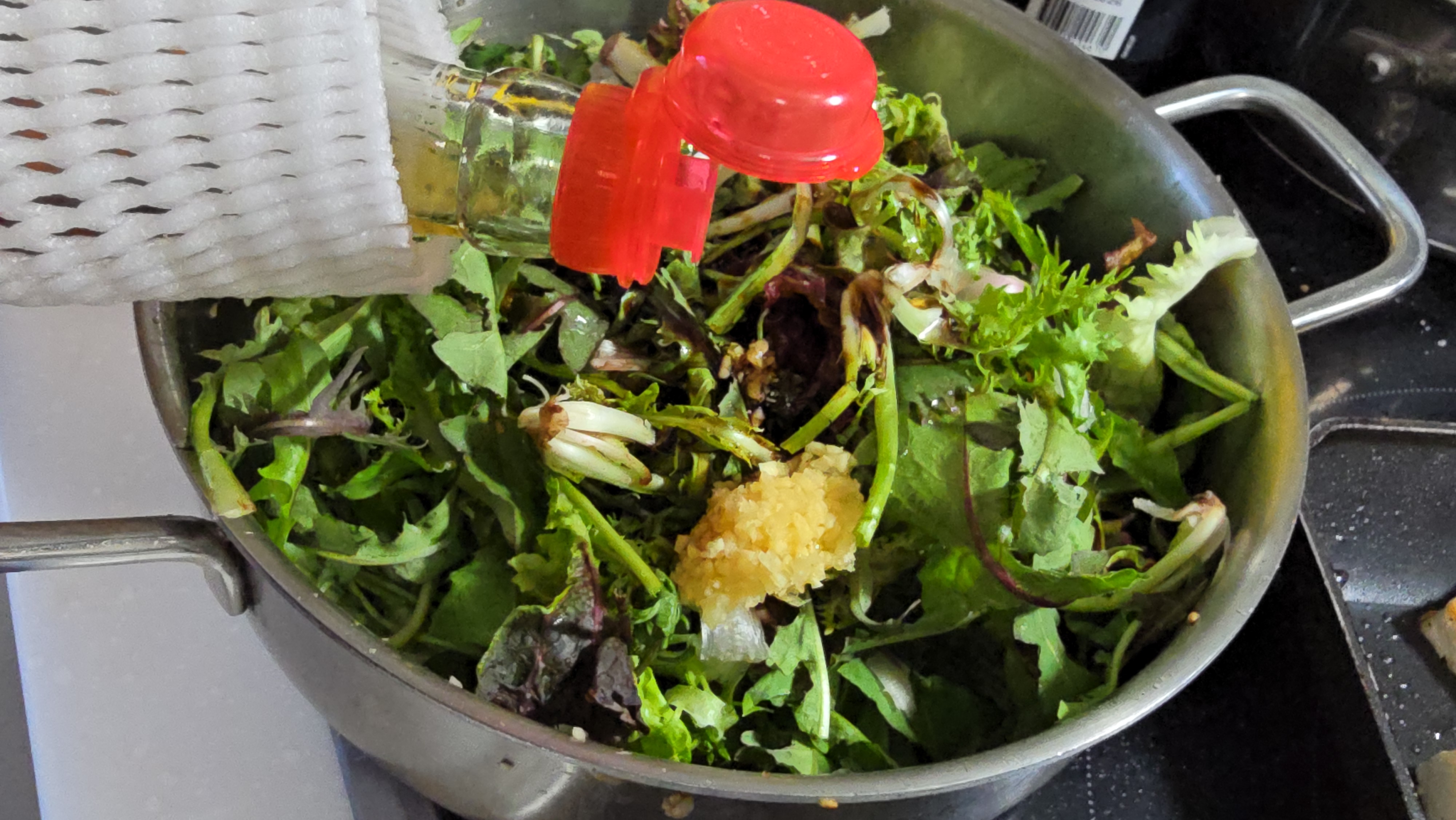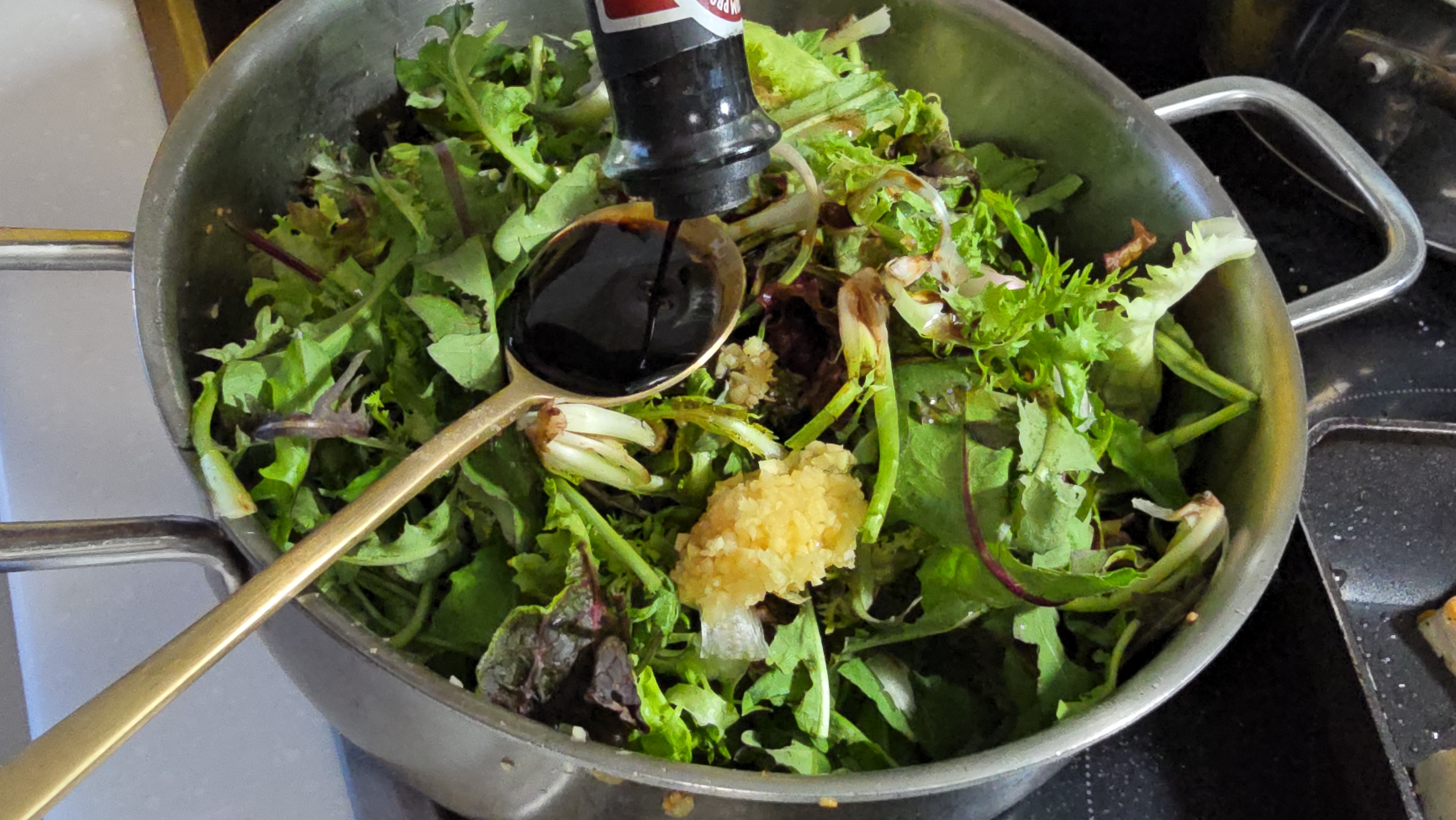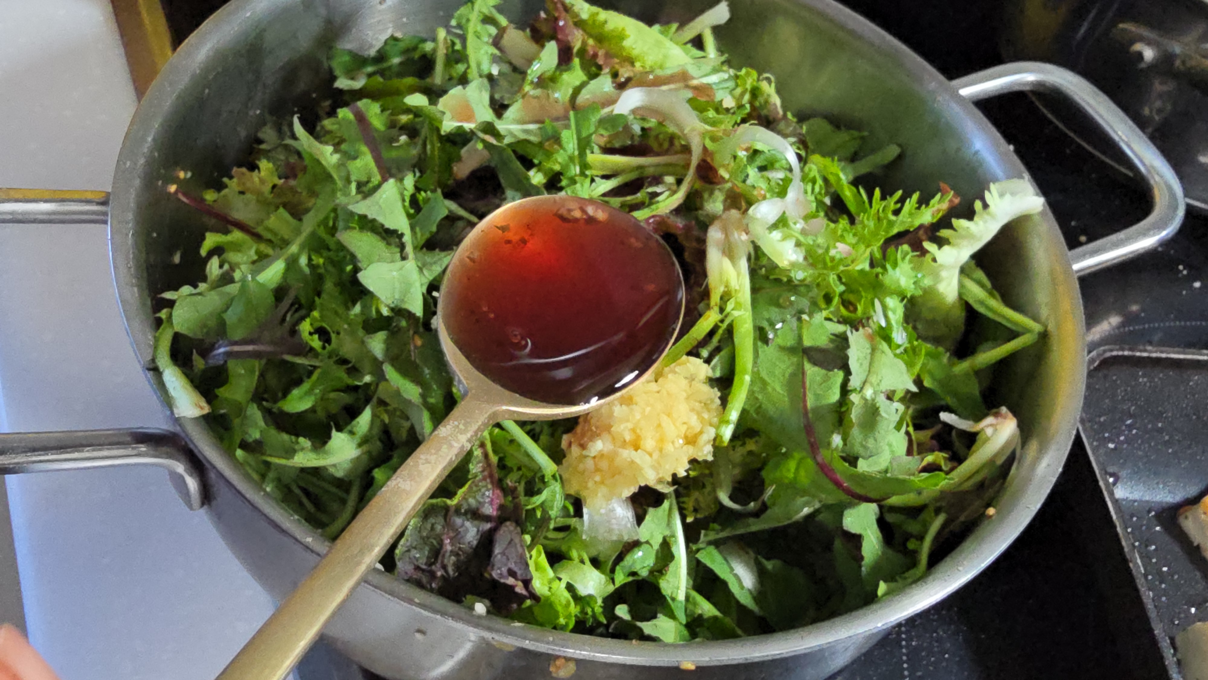 (Mix dandelion with garlic, plum extract, balsamic sauce, sesame oil, sesame seeds, and chili powder)