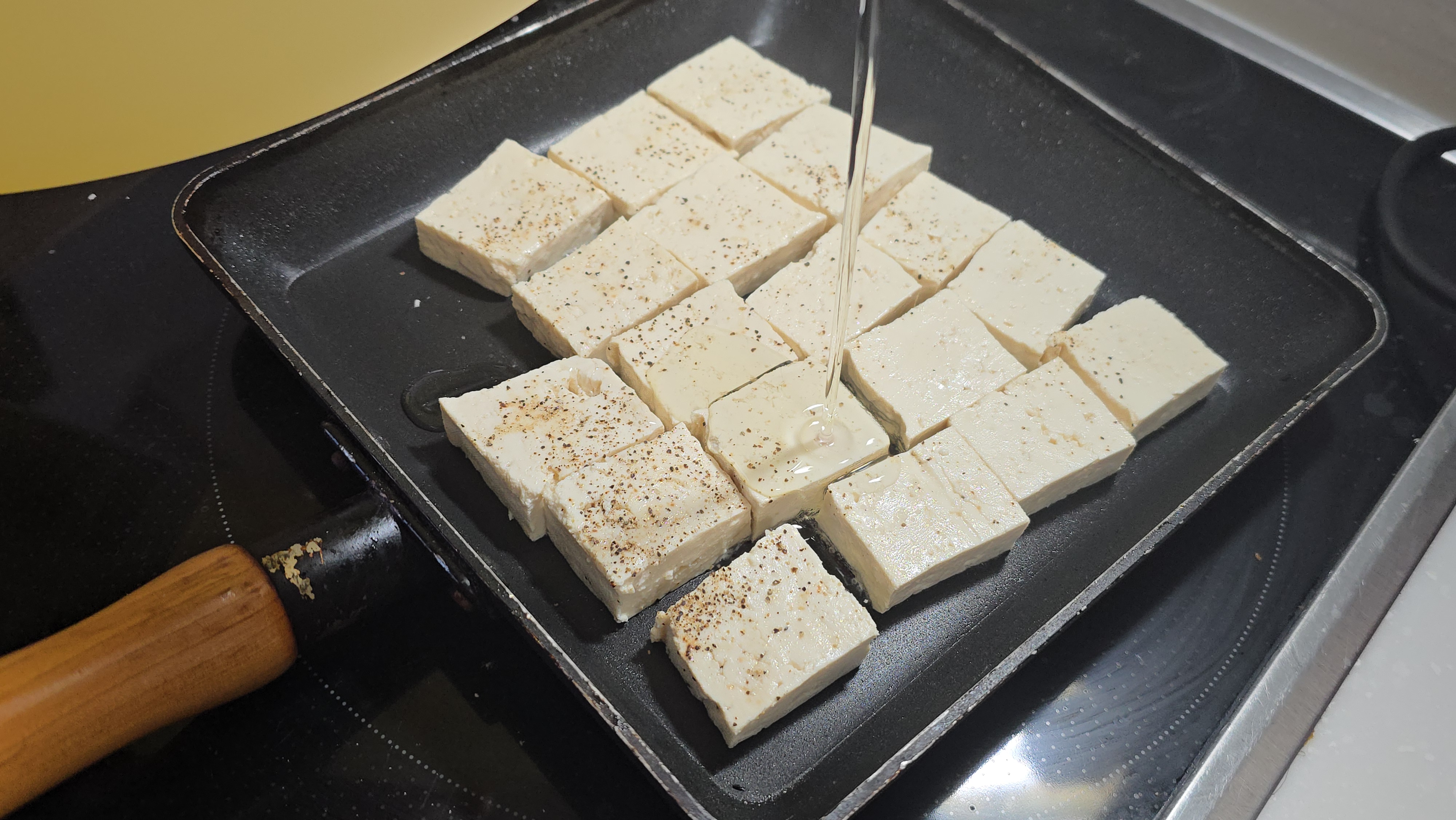 ㉣ 프라이팬에 두부를 담고 식용유를 부어준다.