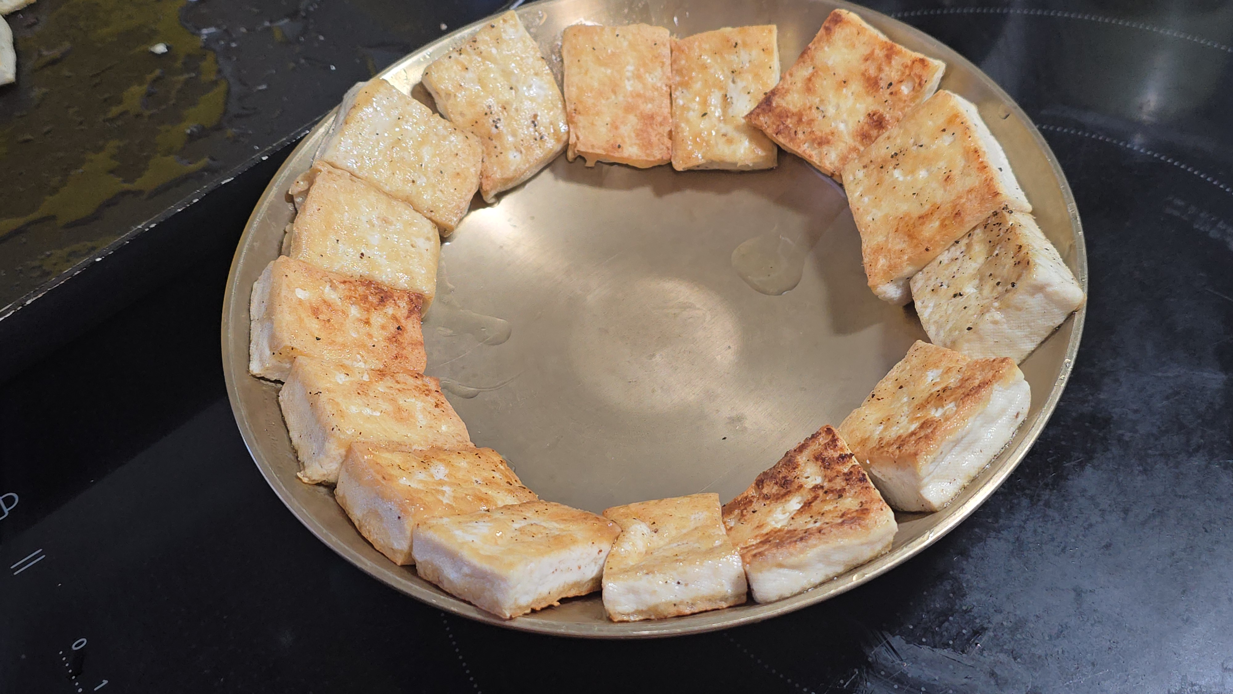 ㉧ 접시에 구운 두부를 돌려 담아준다.